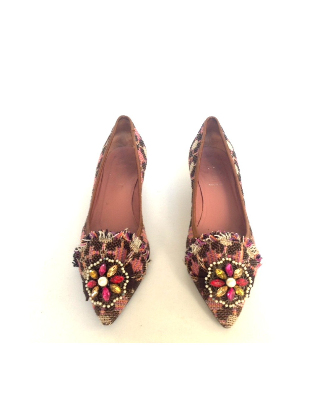 Ballerines Miu Miu en tissu multicolore et bijou en forme de fleur