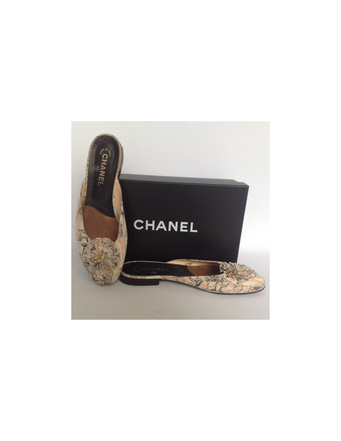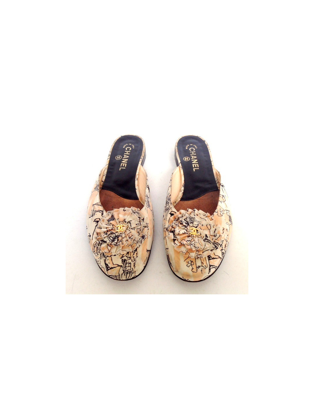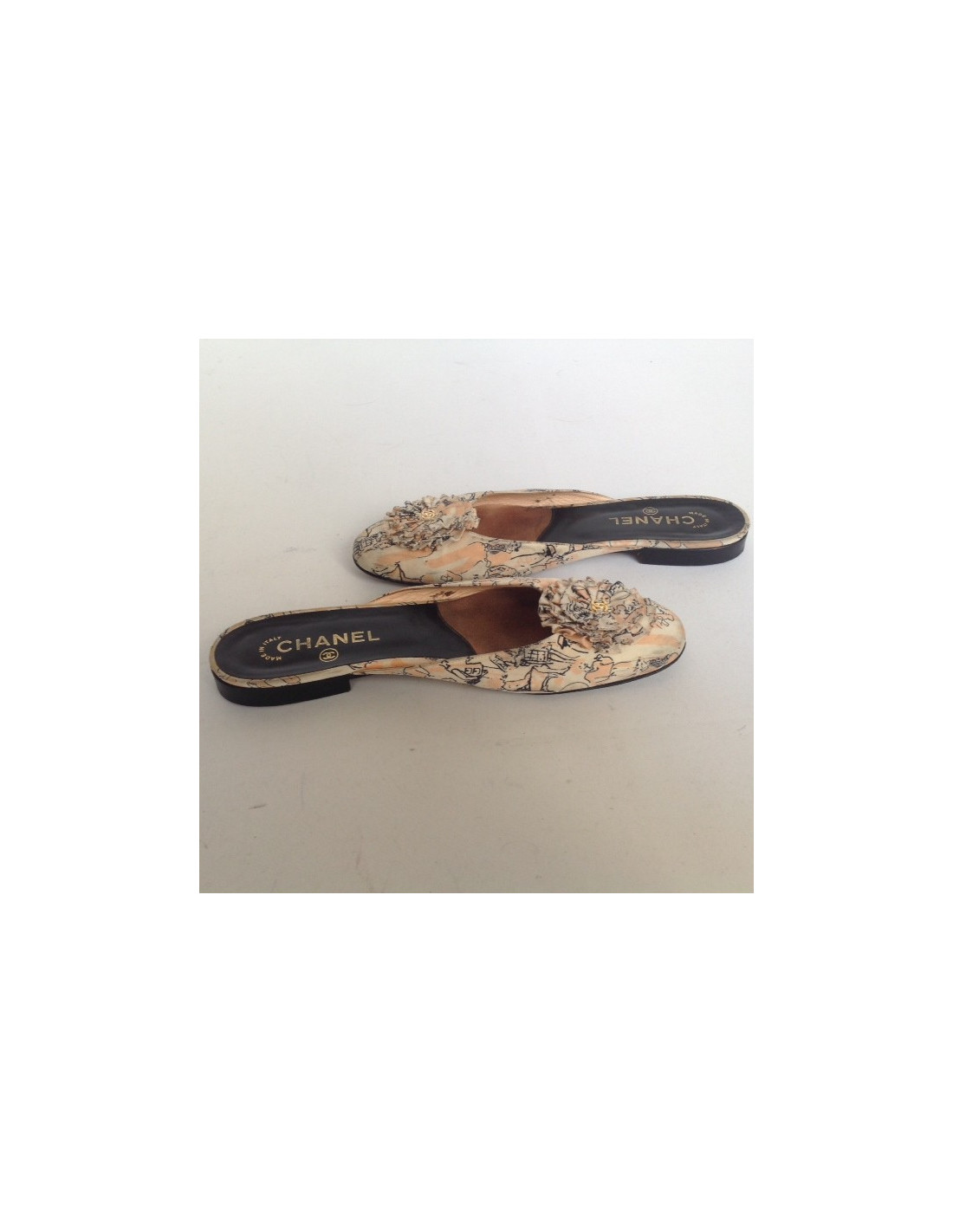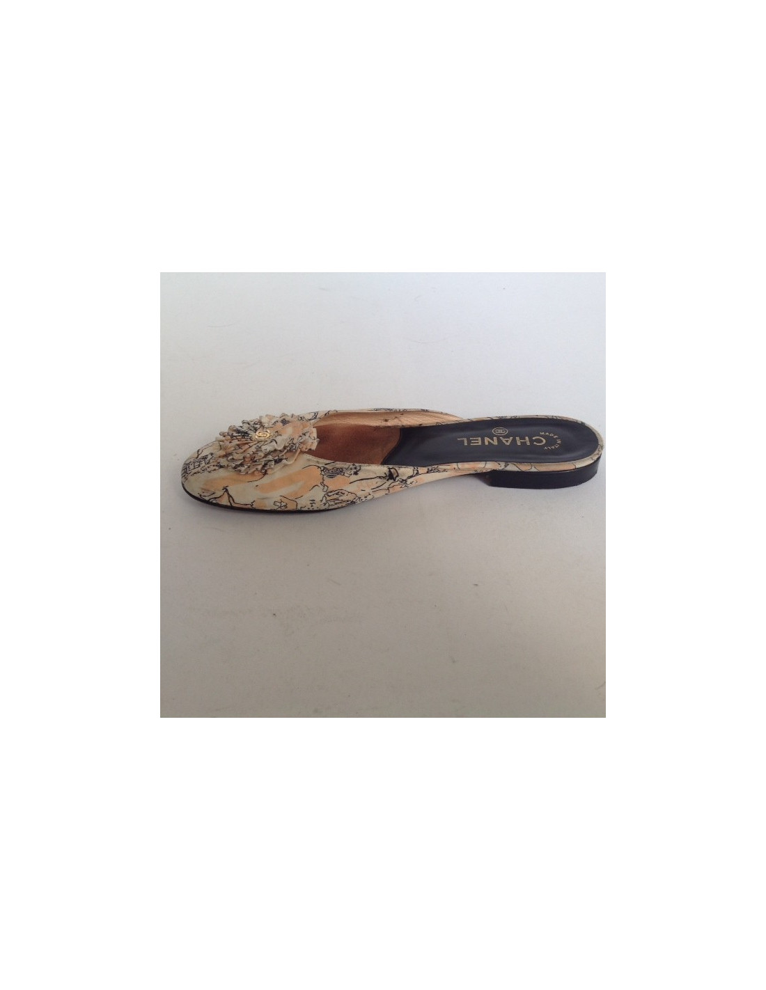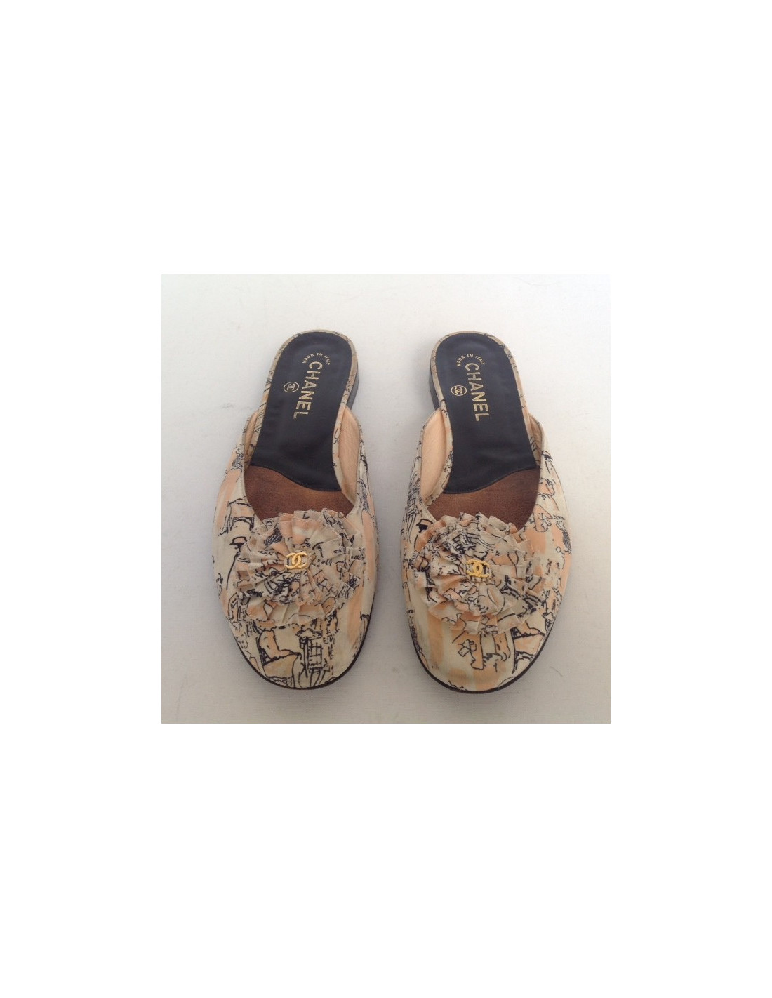 Sandales plates en tissu imprimé Chanel. À l'avant, une rosace en tissu siglée CC en métal doré au centre. En très bon état.