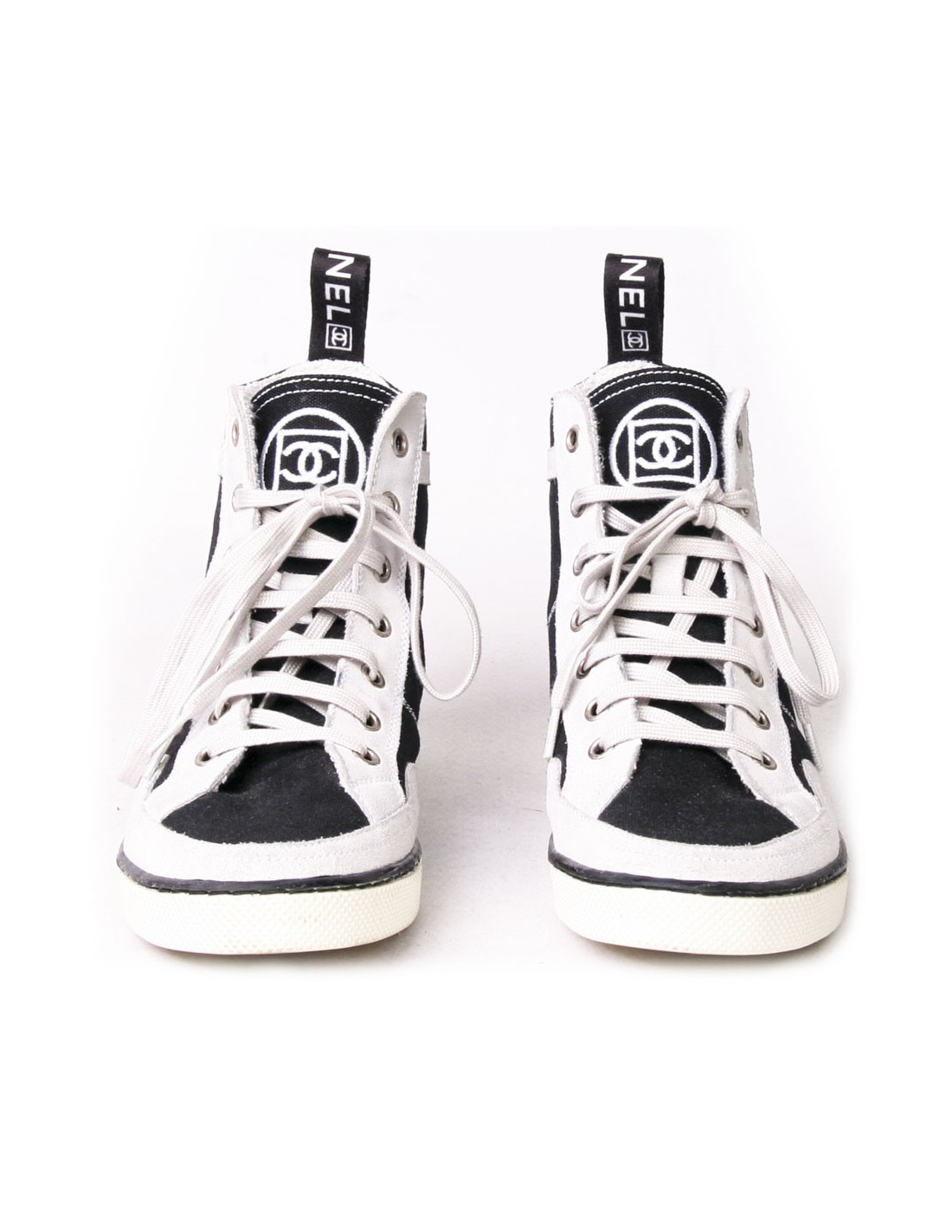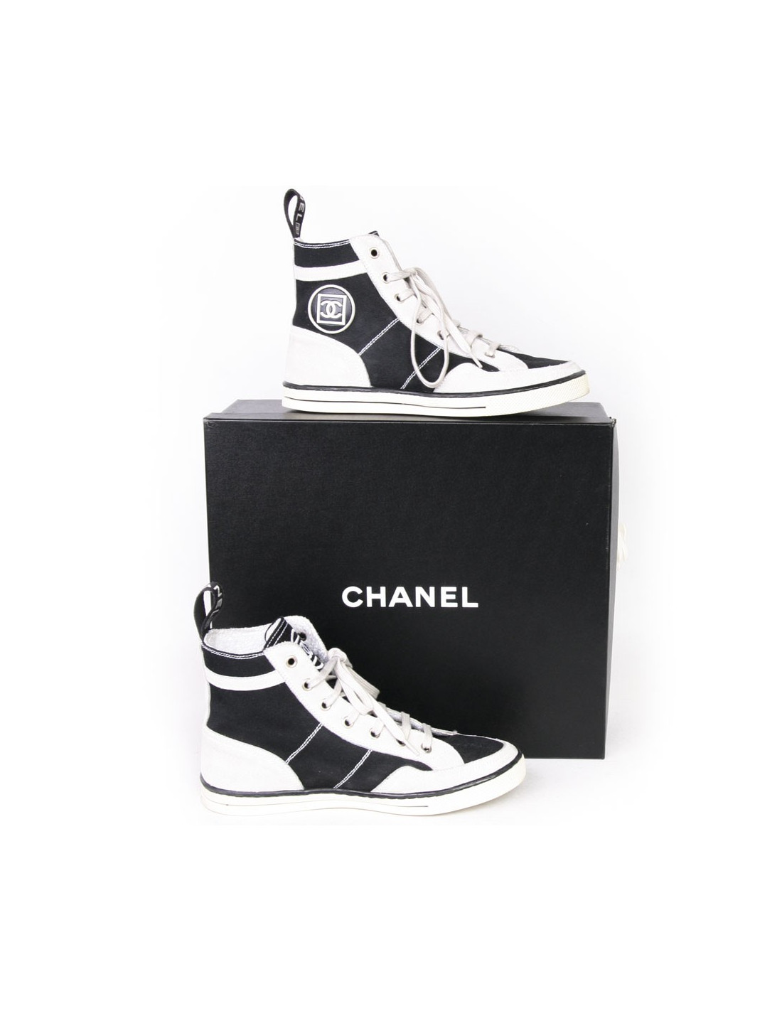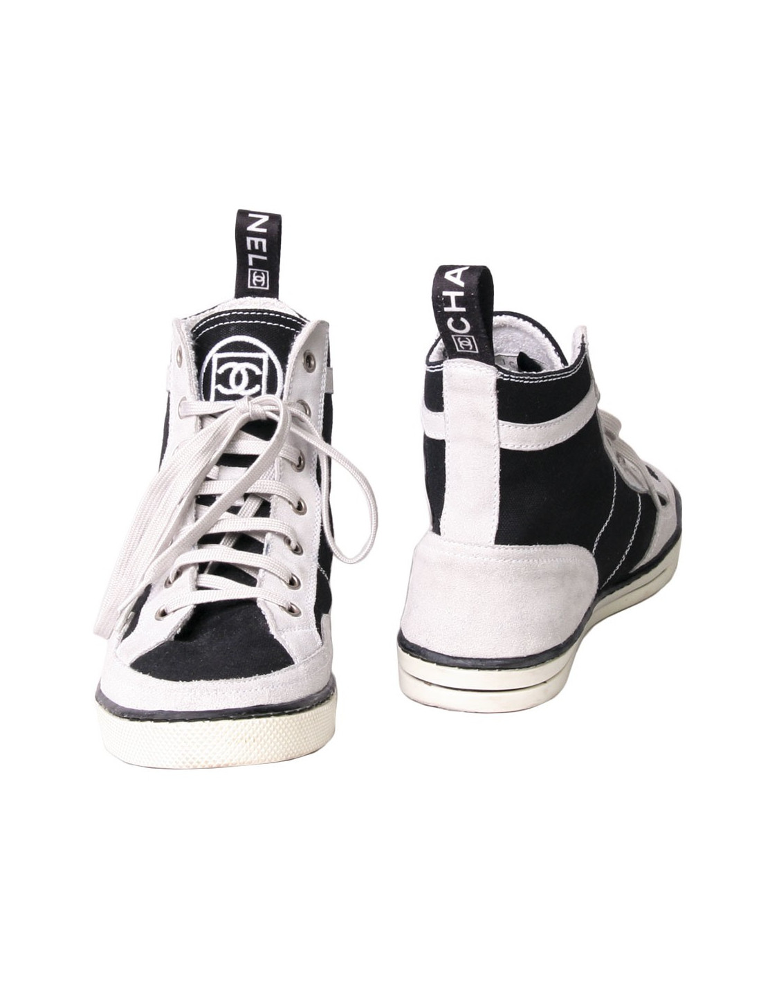 Baskets montantes Chanel en toile et veau velours noire et gris clair. Taille 37. L'intérieur est en éponge blanc. En très bon état. Quelques légères traces bleues mais très peu visible.
