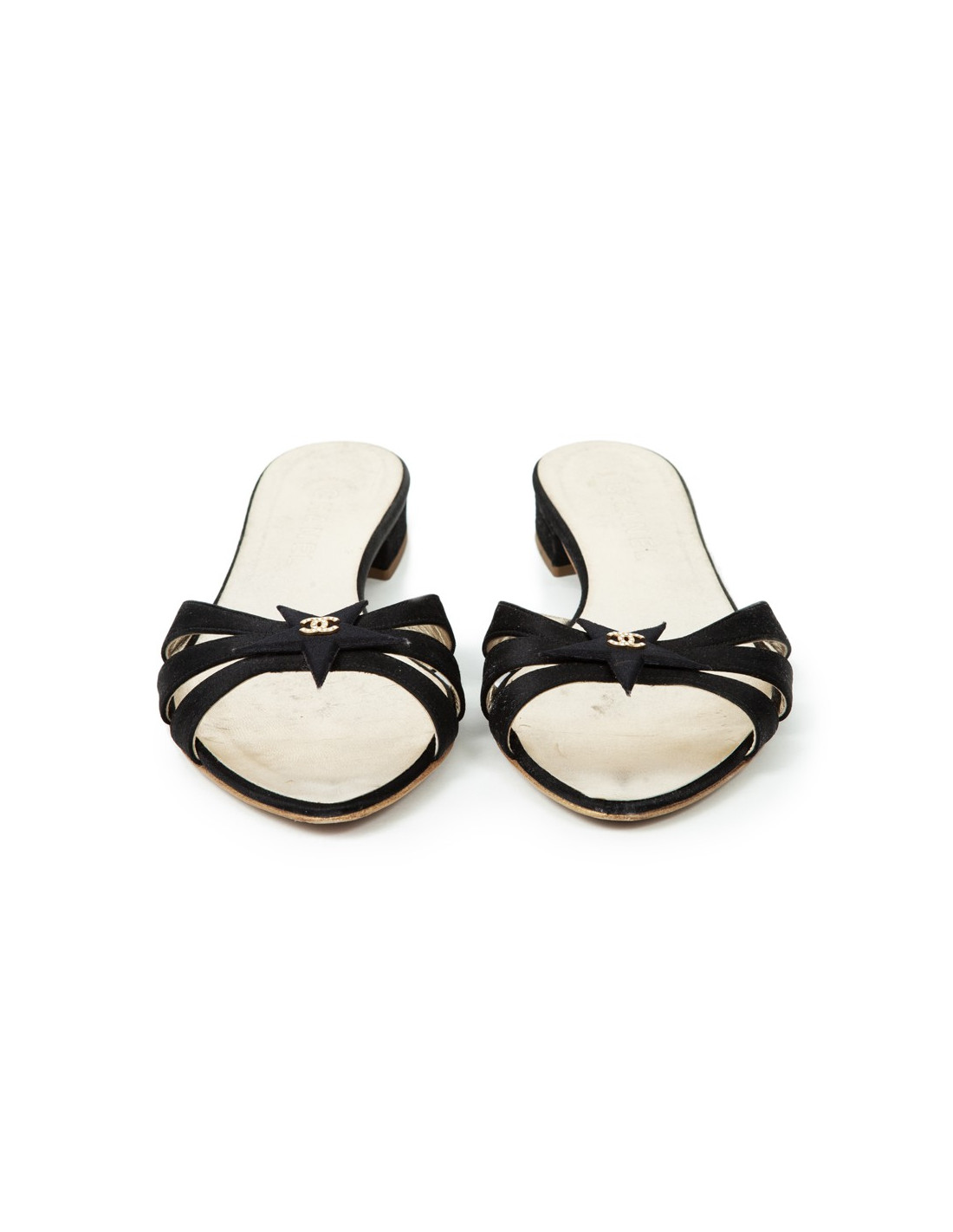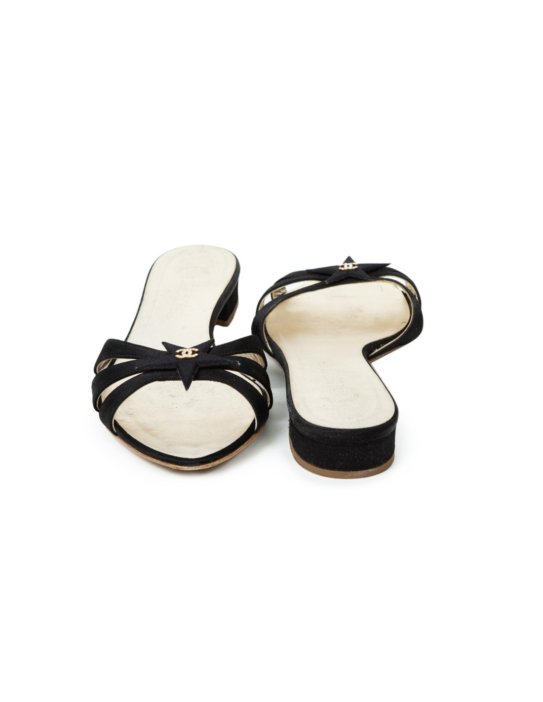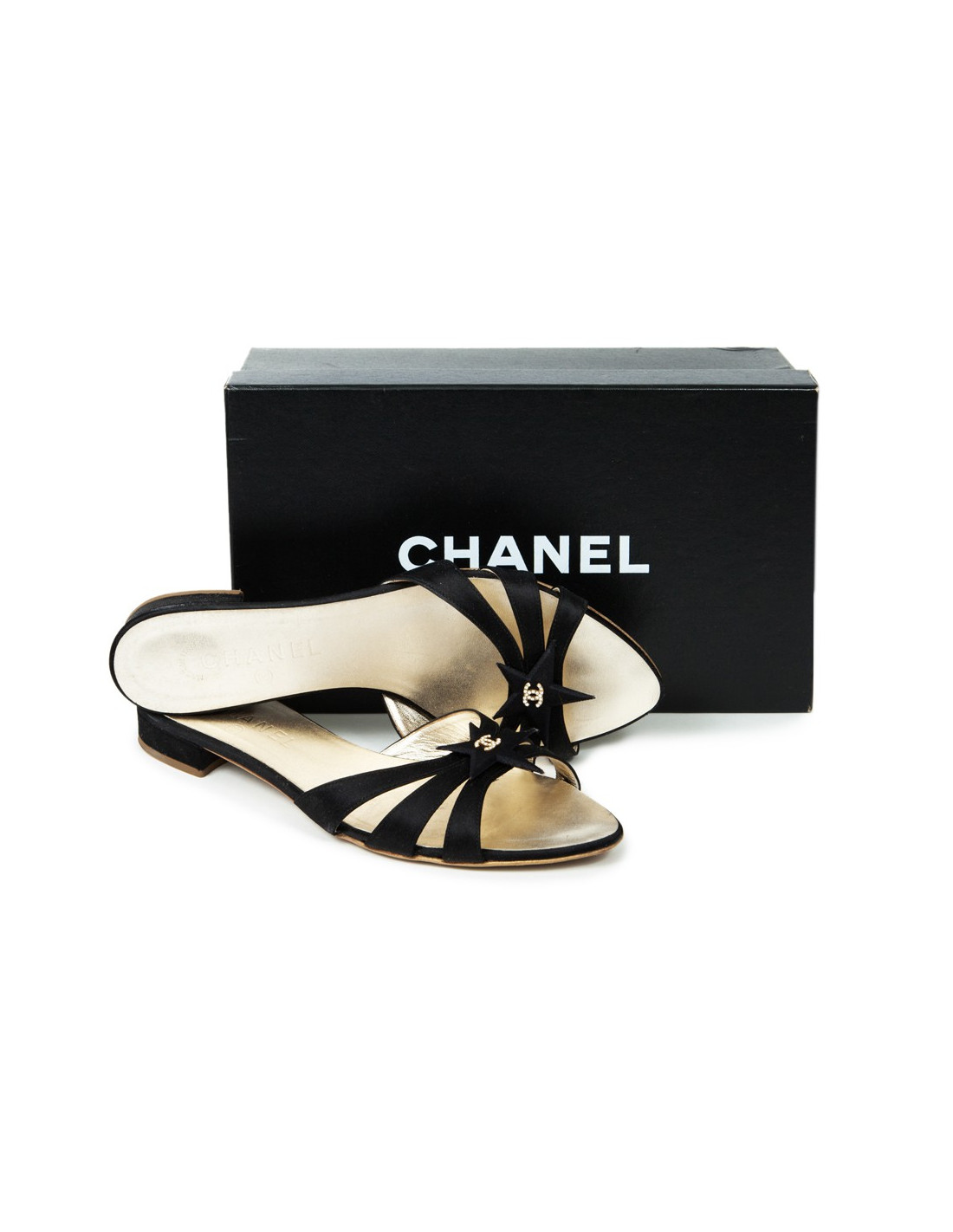 Taille 38,5. Le sigle "CC" doré rempli de strass se trouve sur une étoile à l'avant de la sandale. Semelle intérieure en cuir de couleur or. Petit talon. En très bon état.