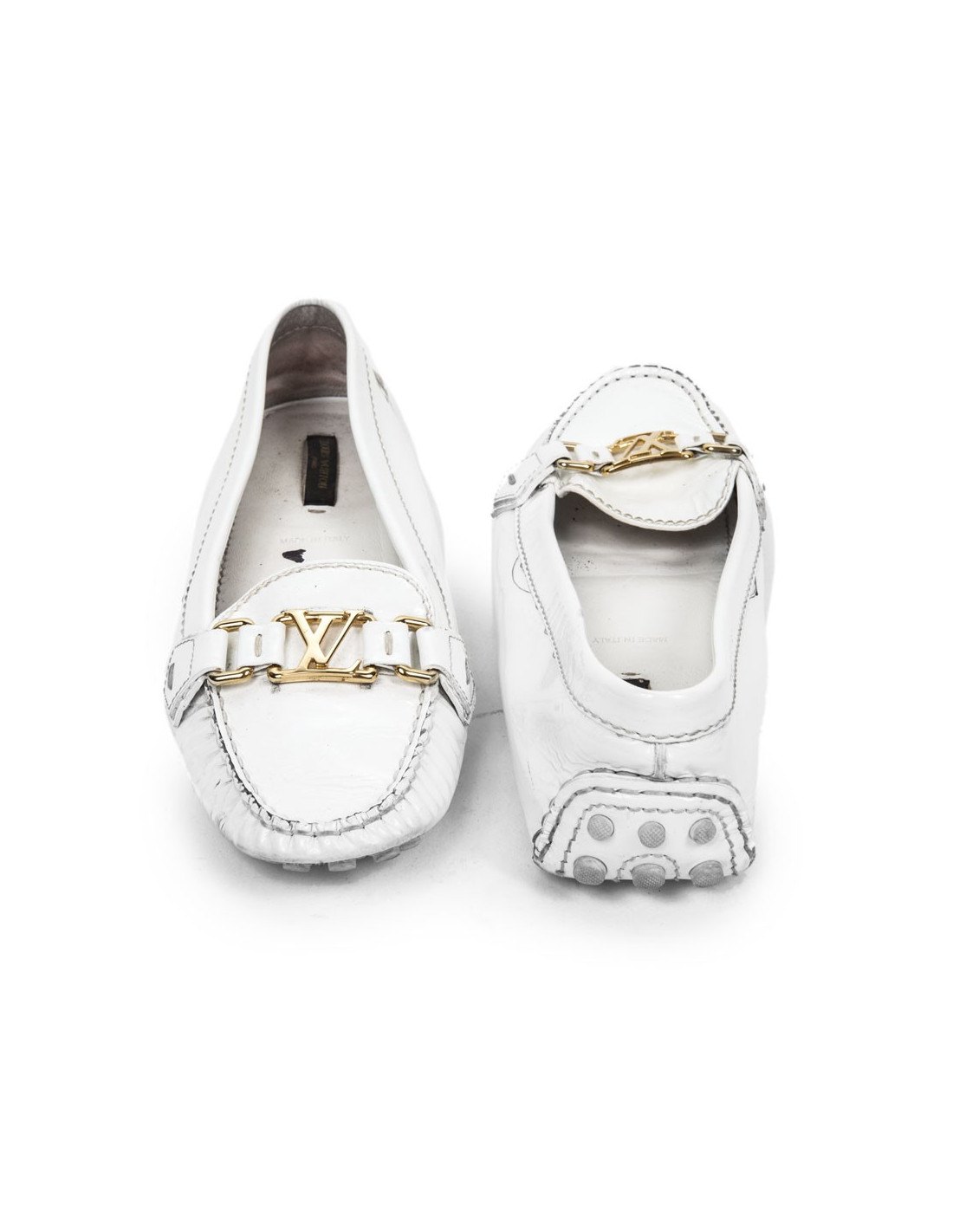 Mocassins de la Maison Louis Vuitton en cuir verni blanc. La bijouterie 'LV' à l'avant de la chaussure est en métal doré.