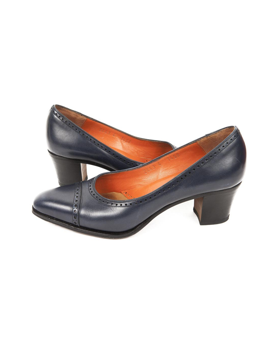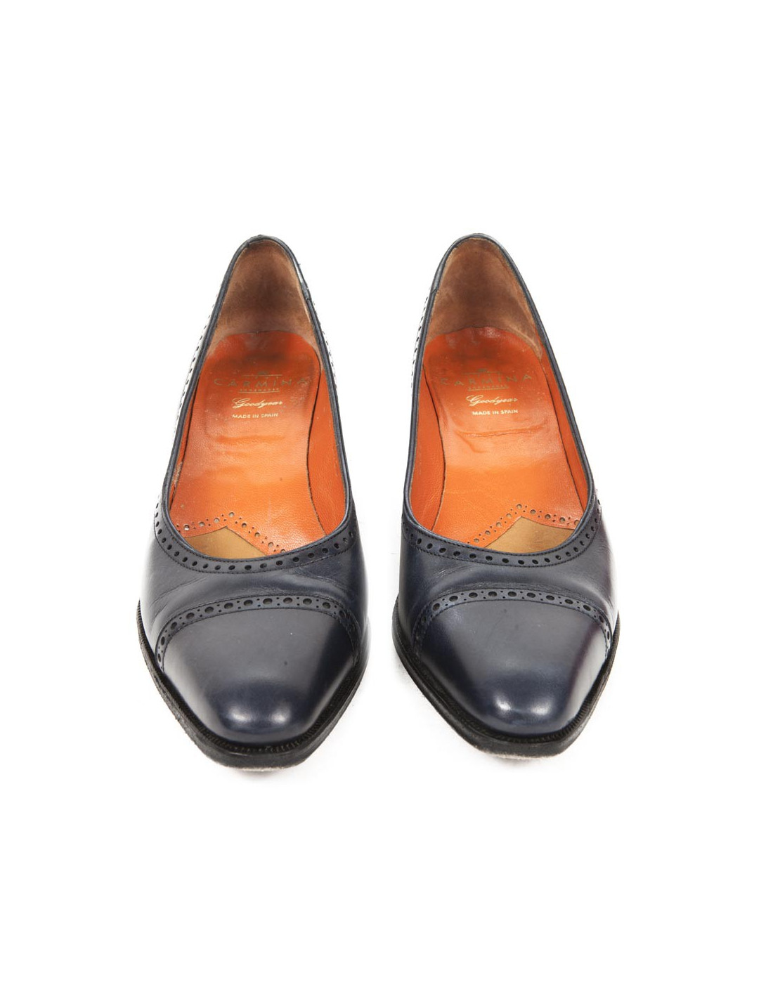 Mocassins avec talon large, haut de 6 cm. Ils sont en cuir lisse perforé bleu nuit; Marque : CARMINA.
