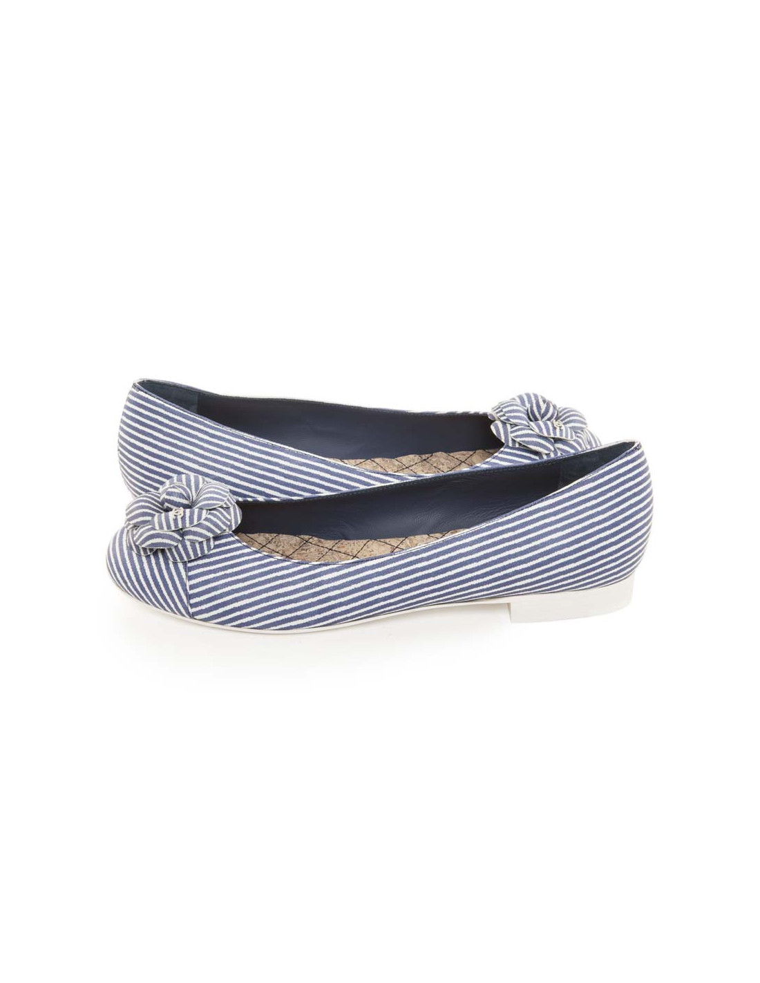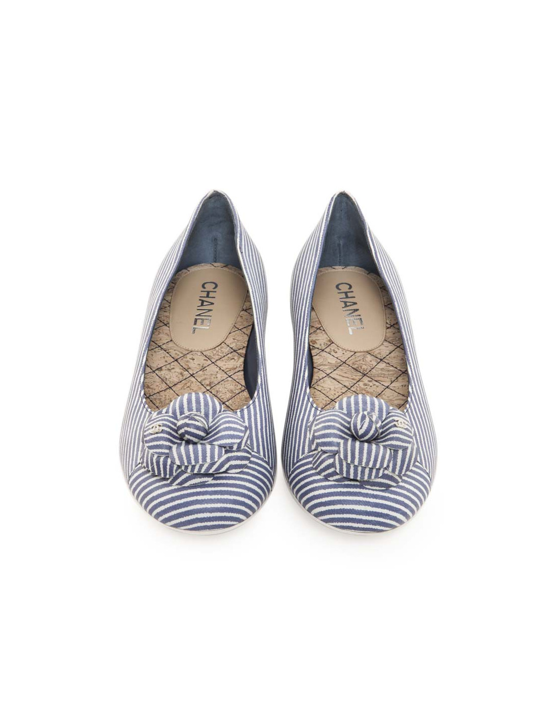 Ballerines de la Maison Chanel en cuir rayé bleu et blanc avec un camélia. Double C sur le camélia en métal argent palladié .Taille 38. Semelle intérieure rembourrée par une semelle façon liège, pour plus de confort. (ventes privées 2016). Etat neuf.