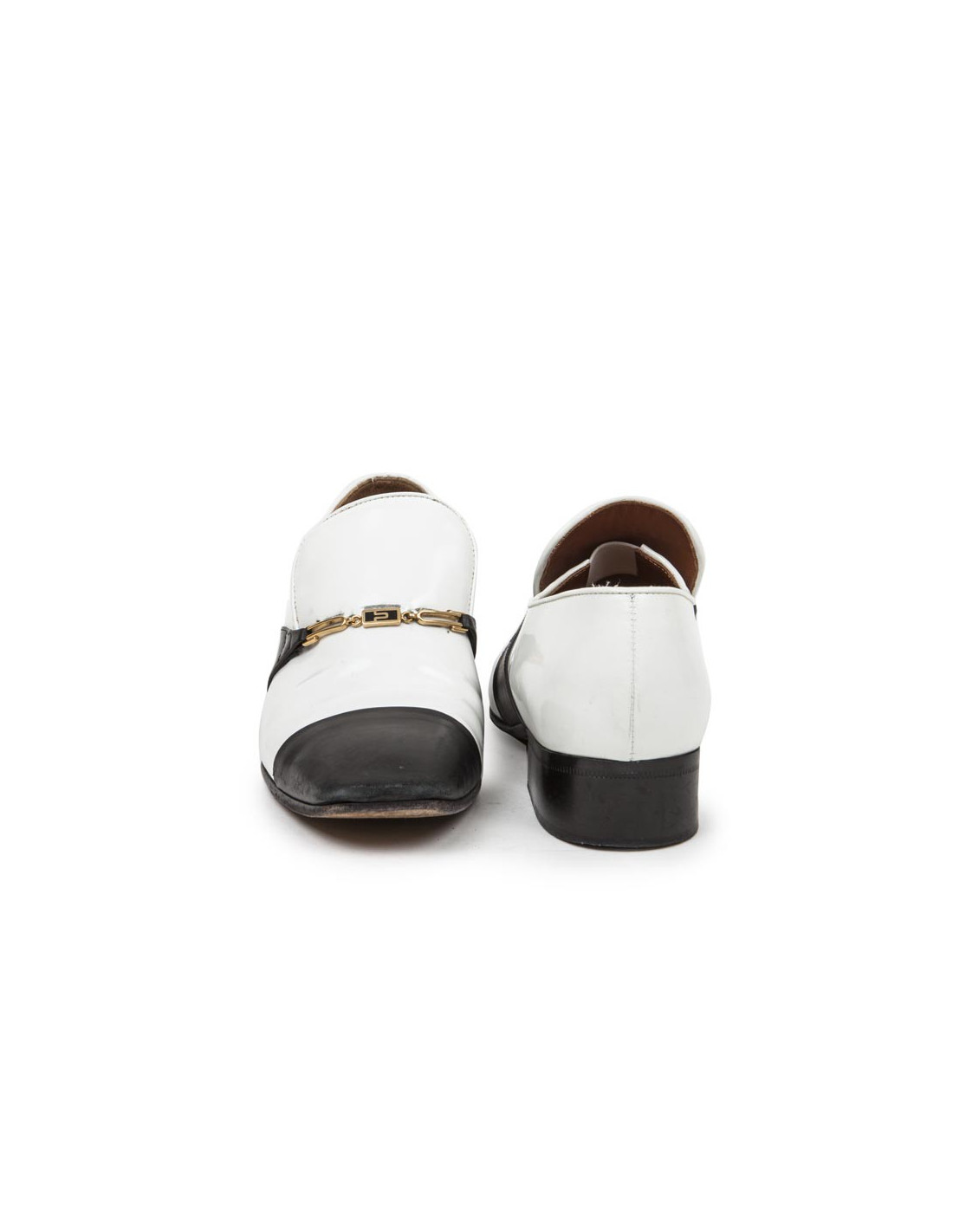 Mocassins T 38 CELINE en cuir bicolore blanc verni et noir avec petits talons de 3 cm. Chaine dorée à l'avant de la chaussure.