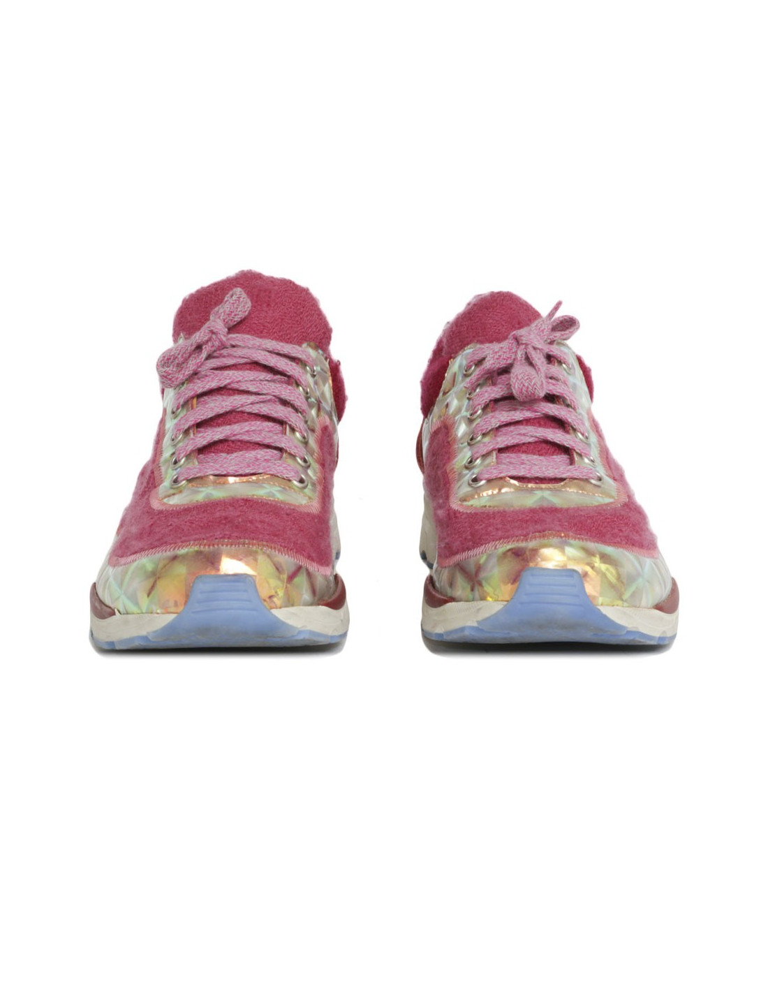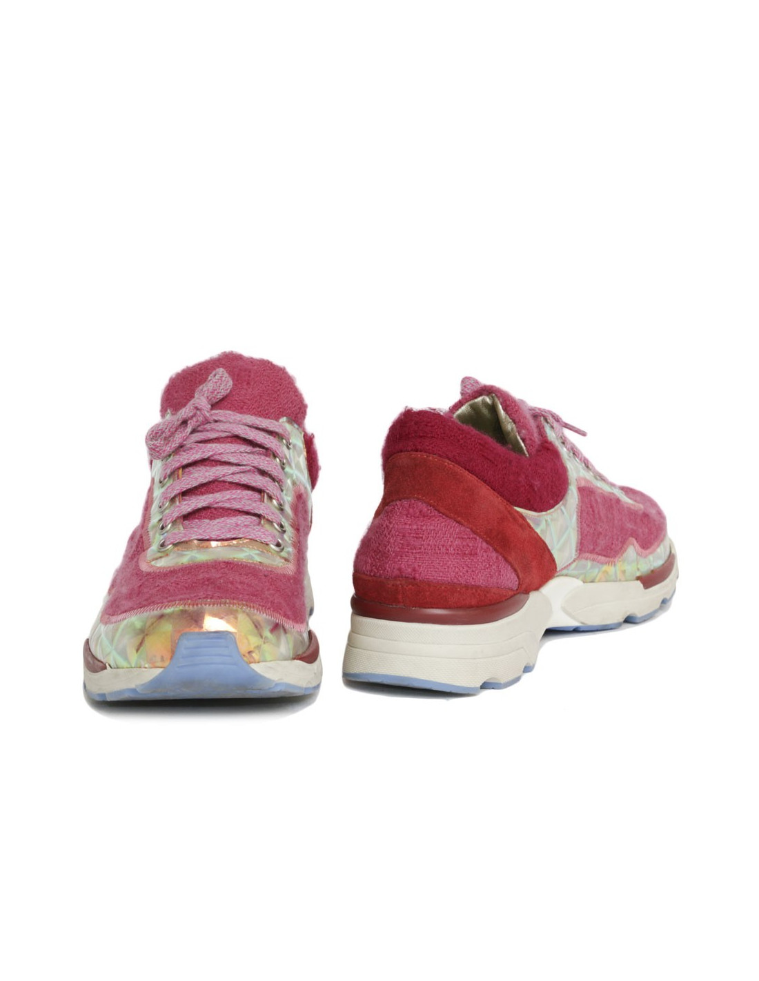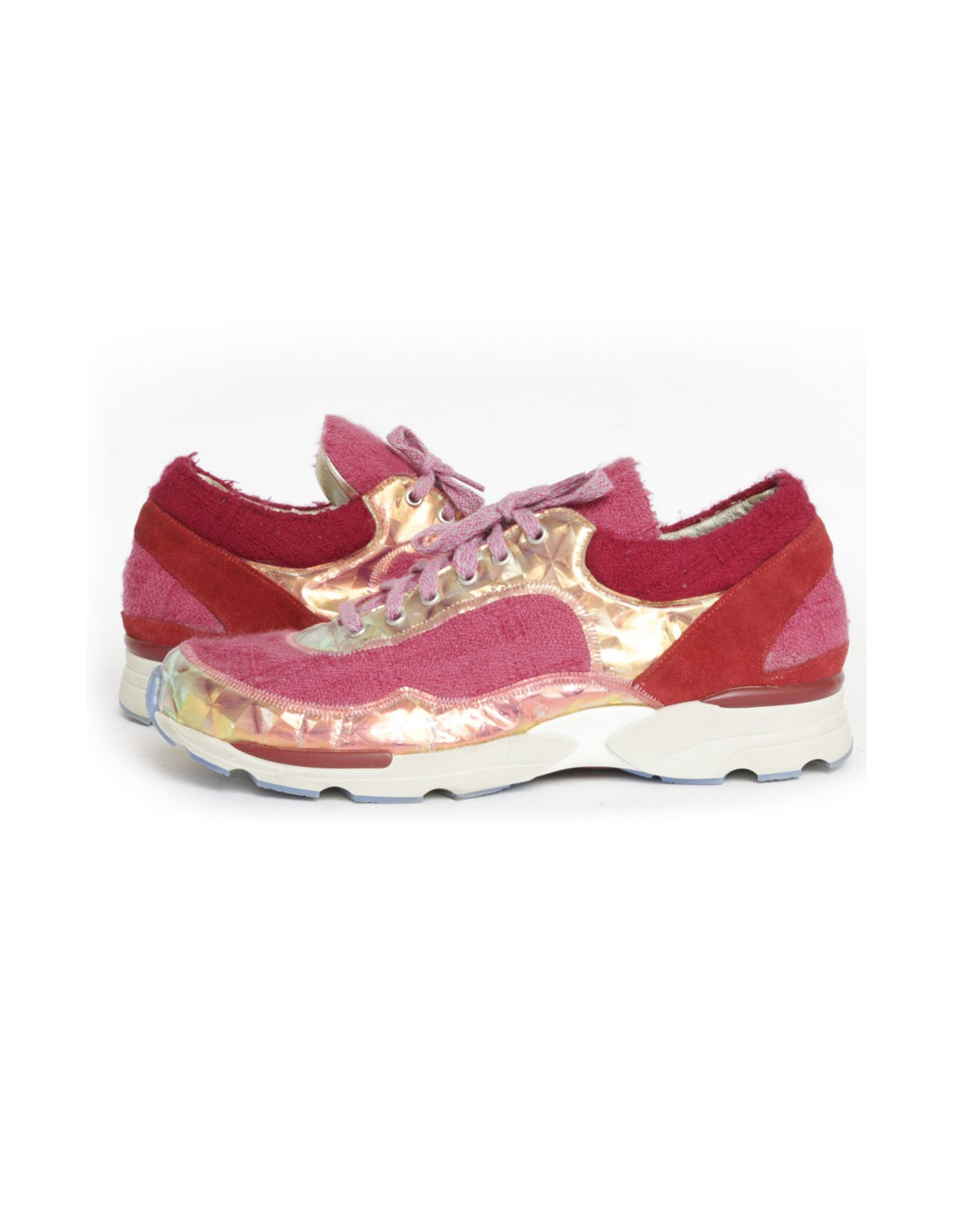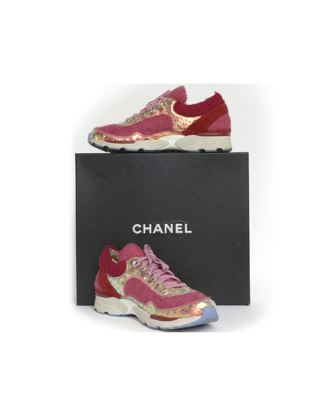 Sneakers en tweed de la Maison Chanel par Massaro. Dégradé de rose. Semelles en caoutchouc. Provient des soldes. Cette paire de baskets Chanel est sur le point de devenir un collector, ne passez pas votre chemin, aujourd’hui les baskets Chanel se vendent en boutique comme des petits pains, aussitôt sorties aussitôt vendues, alors plus d’hésitation! Le 3X sans frais est disponible pour ces chaussures pour tout client disposant d’un compte bancaire en France, avec une livraison express en 48 heures. Sinon vous pouvez aussi aller les récupérer directement à notre boutique parisienne, située au 8 rue des Saussaies 75008 Paris où elles sont stockées.