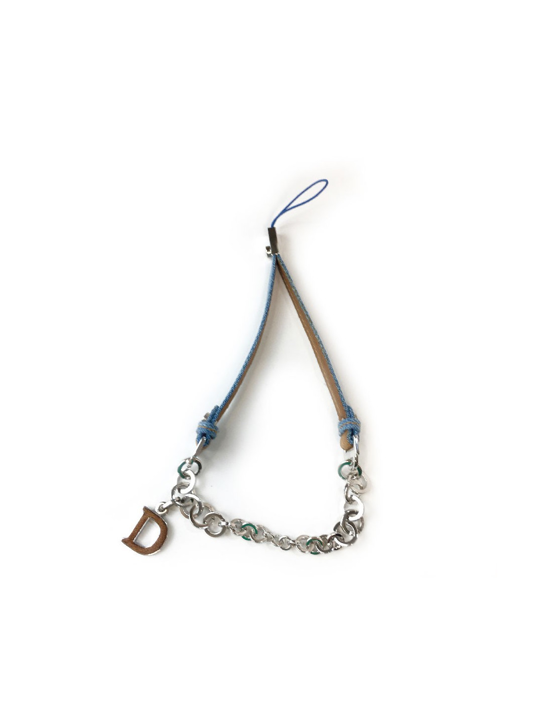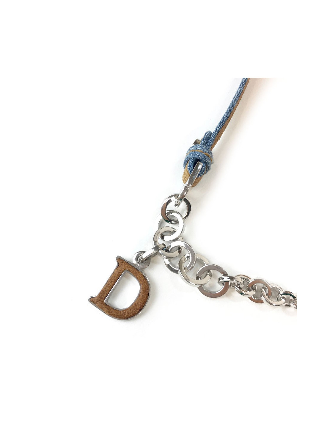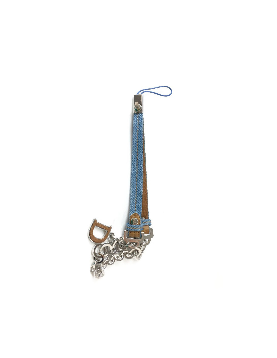 Charm ou bijou de sac Christian Dior en denim bleu clair et cuir naturel. Chaîne en métal argenté, pendentif D en métal et cuir. Etat impeccable.