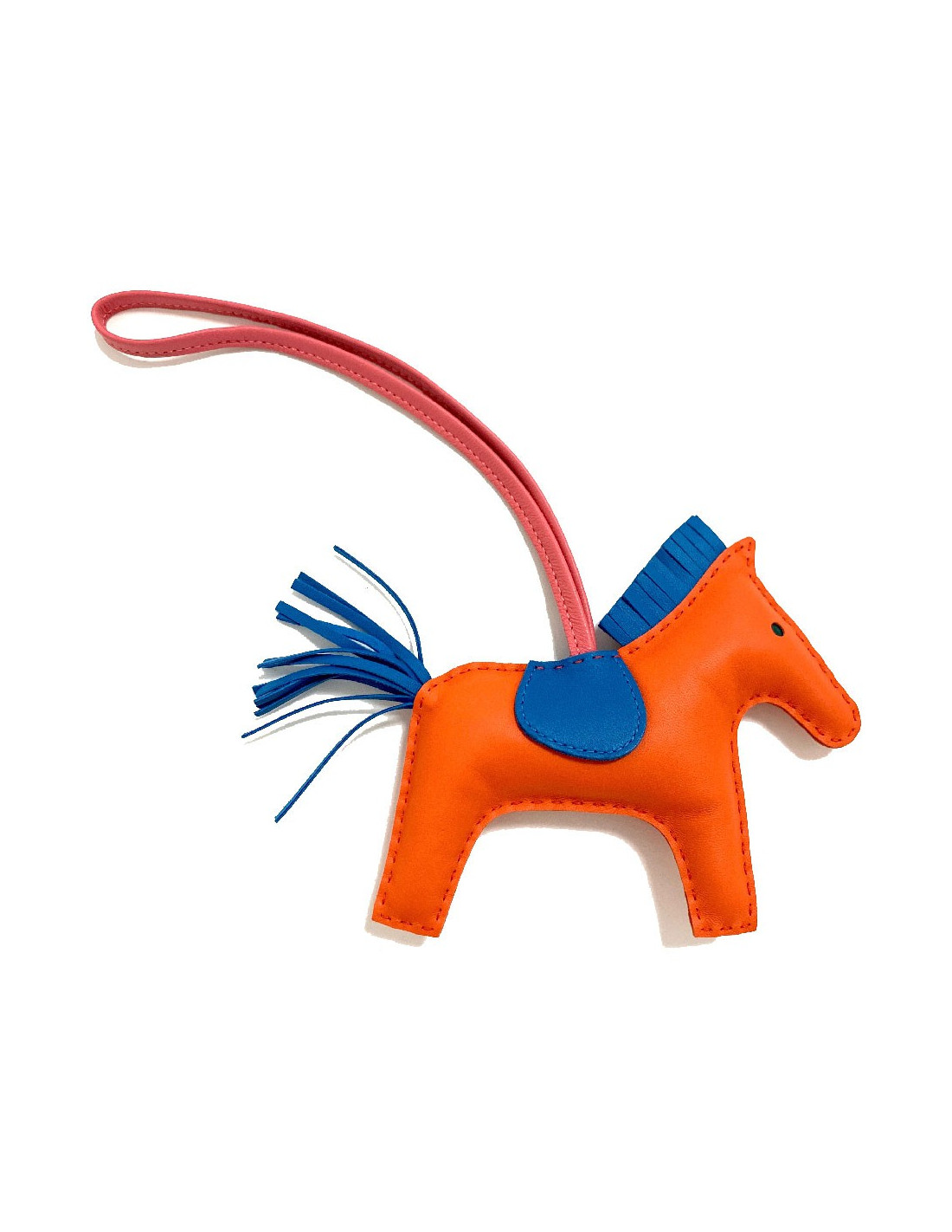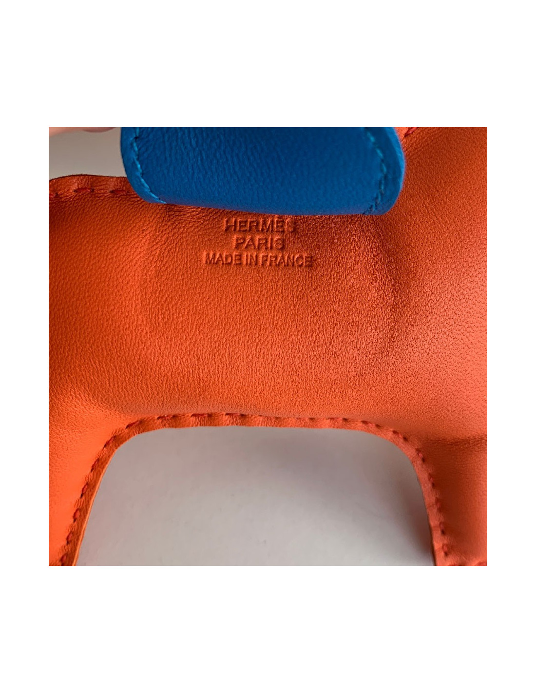 Beau charm HERMES cheval, modèle rodéo en cuir orange, bleu et lanière en cuir rose.