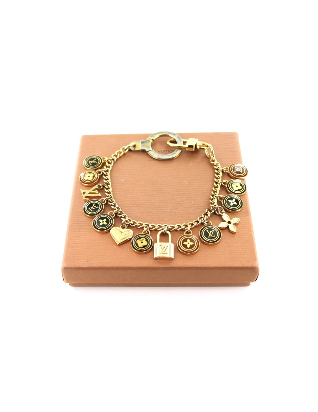 Porte-clés LOUIS VUITTON charm's en métal doré. Double fermeture : une fermeture ronde coulissante (ayant perdu sa coloration dorée) et une fermeture mousqueton en métal doré siglée LV. Ce porte-clés est composé de 14 charm's représentant tous les symboles de la Maison Louis Vuitton (cadenas, trèfle, etc) de couleurs noir et bordeaux. Micro-rayures d'usure. Vendu avec son dustbag et sa boîte d'origine.