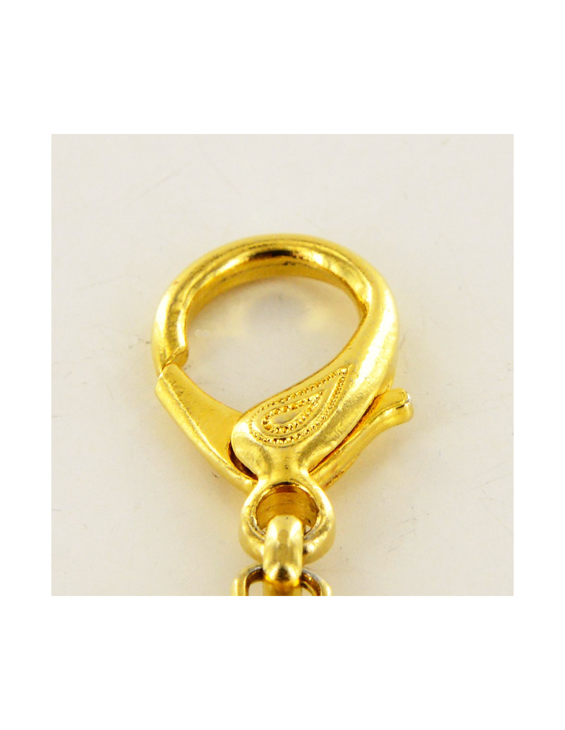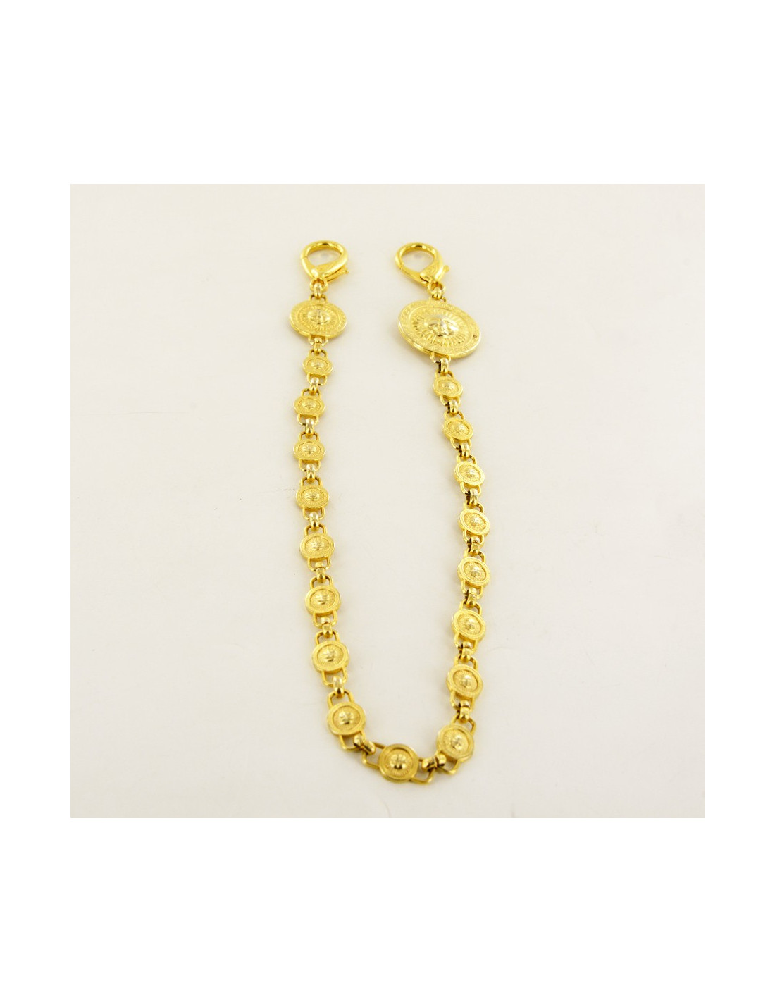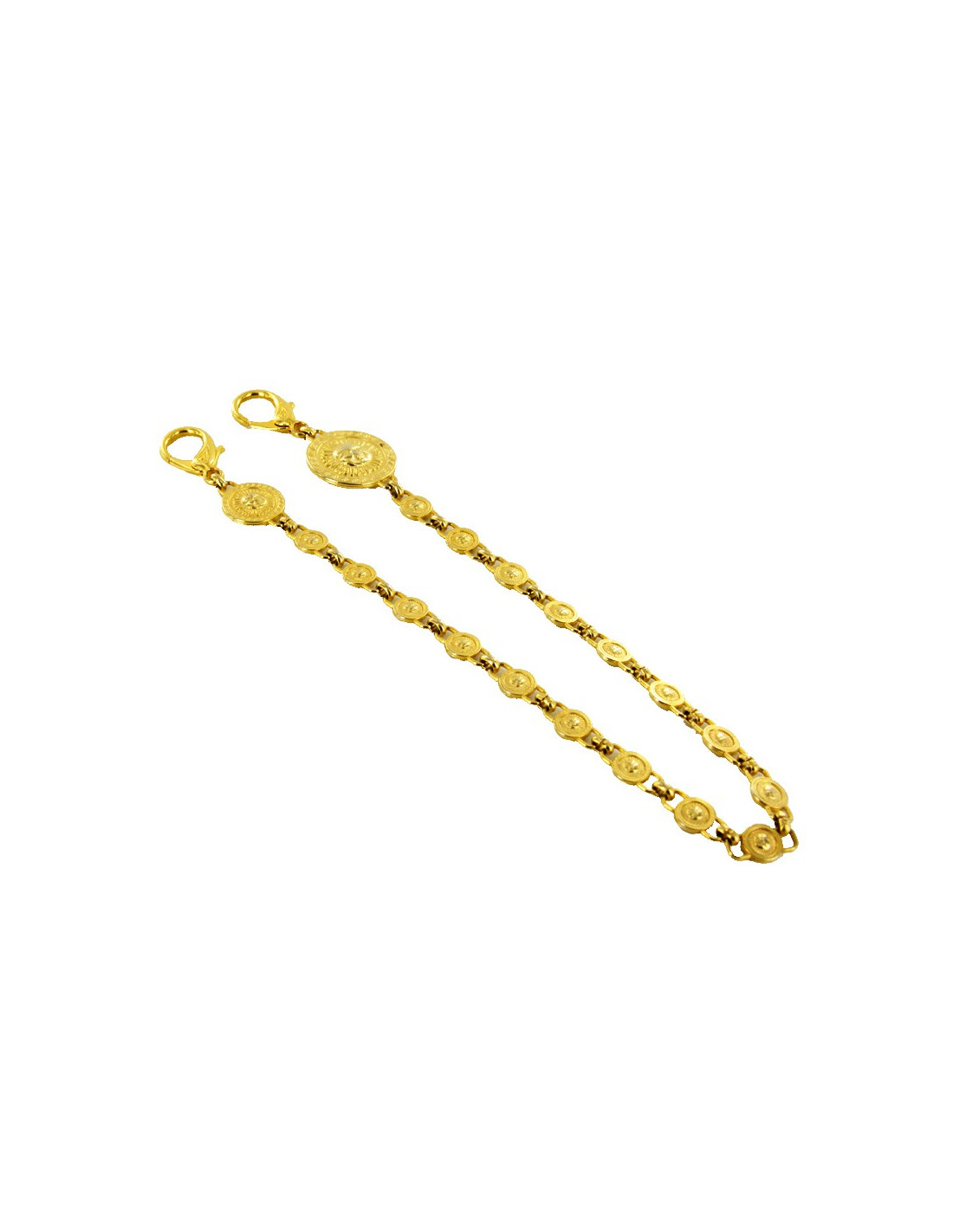 Bijou de sac Versace, chaîne qui comporte 19 maillons en métal doré, grâce à ses deux fermoirs mousqueton, vous aurez la possibilité d'accrocher le bijou où bon vous semble, sacs, ceintures ou colliers. Livré dans une petite boîte noire.