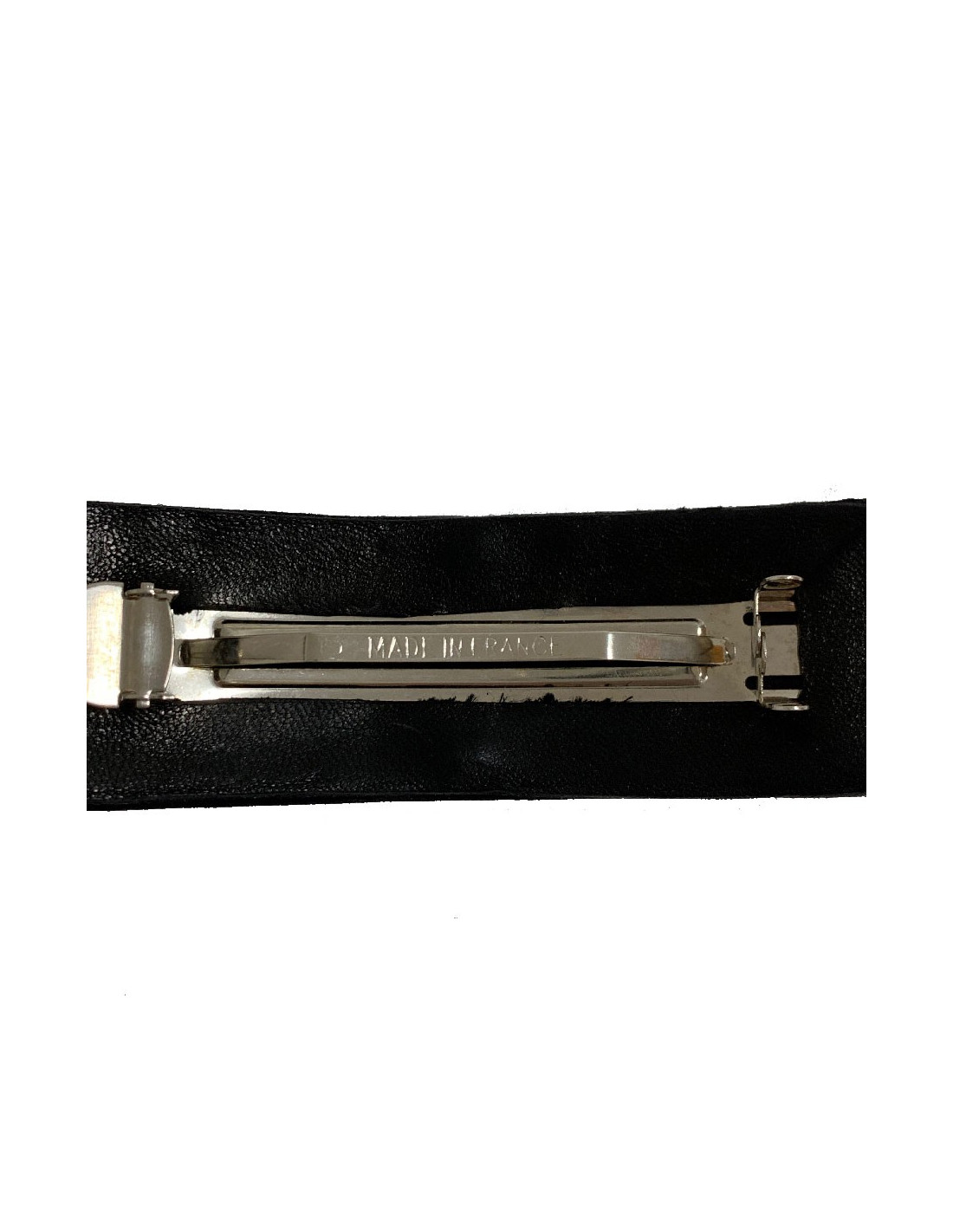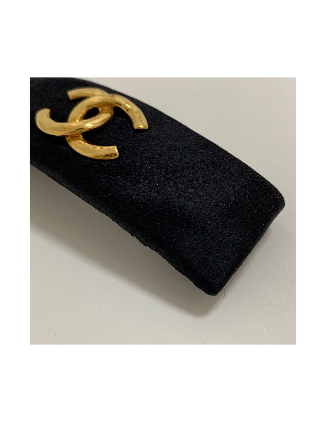 Elégante barrette CHANEL CC en satin noir sur le dessus, un CC doré. Le dos de la barrette est en cuir noir. Le système de fermeture fonctionne très bien et vous permettra d'attacher vos cheveux avec élégance.