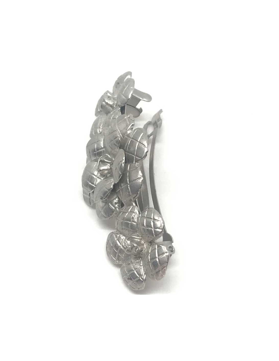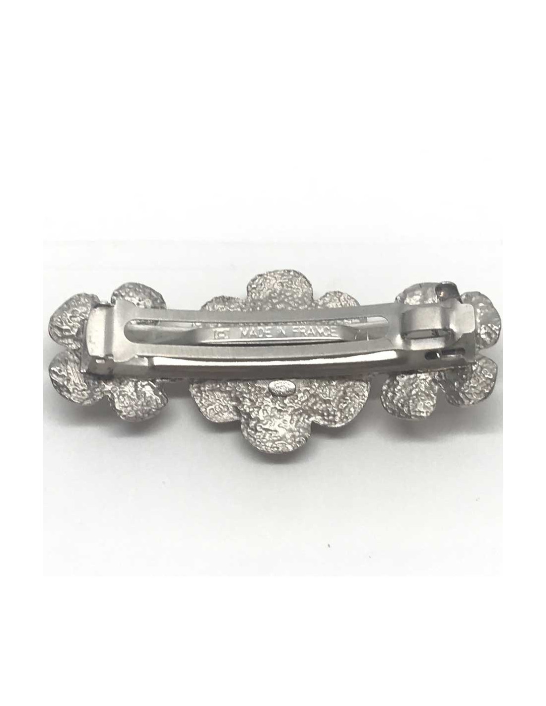 Barrette vintage se composant de trois camélias, emblème de la marque de la Maison française CHANEL. La couleur argent de la barrette est striée sur chacun des pétales.
