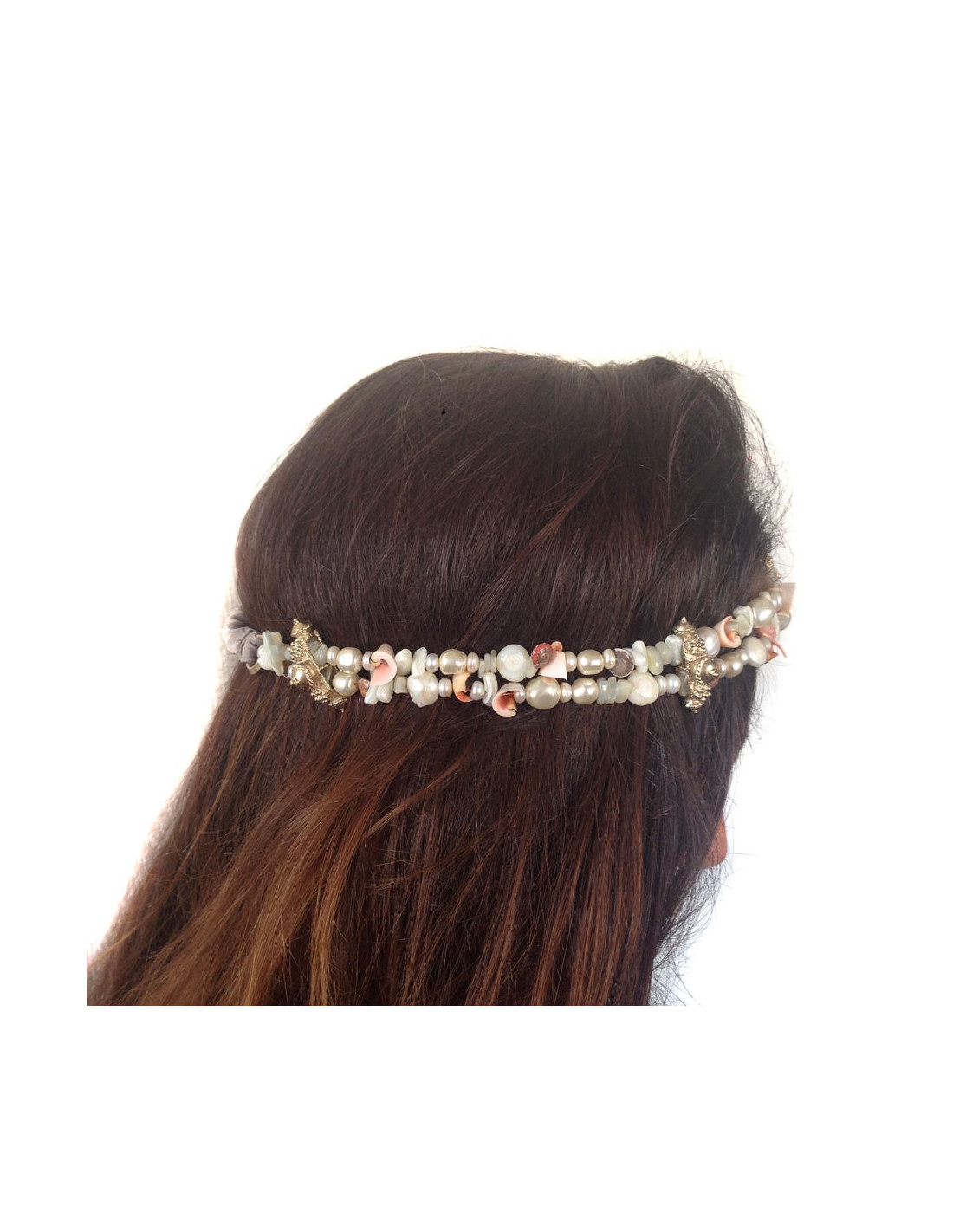 Superbe serre- tête bijou CHANEL, Collection Paris-Bombay année 2012, coquillages, perles d'eau douce et empiècements en métal doré pâle, élastique recouvert de tissu gris-beige.