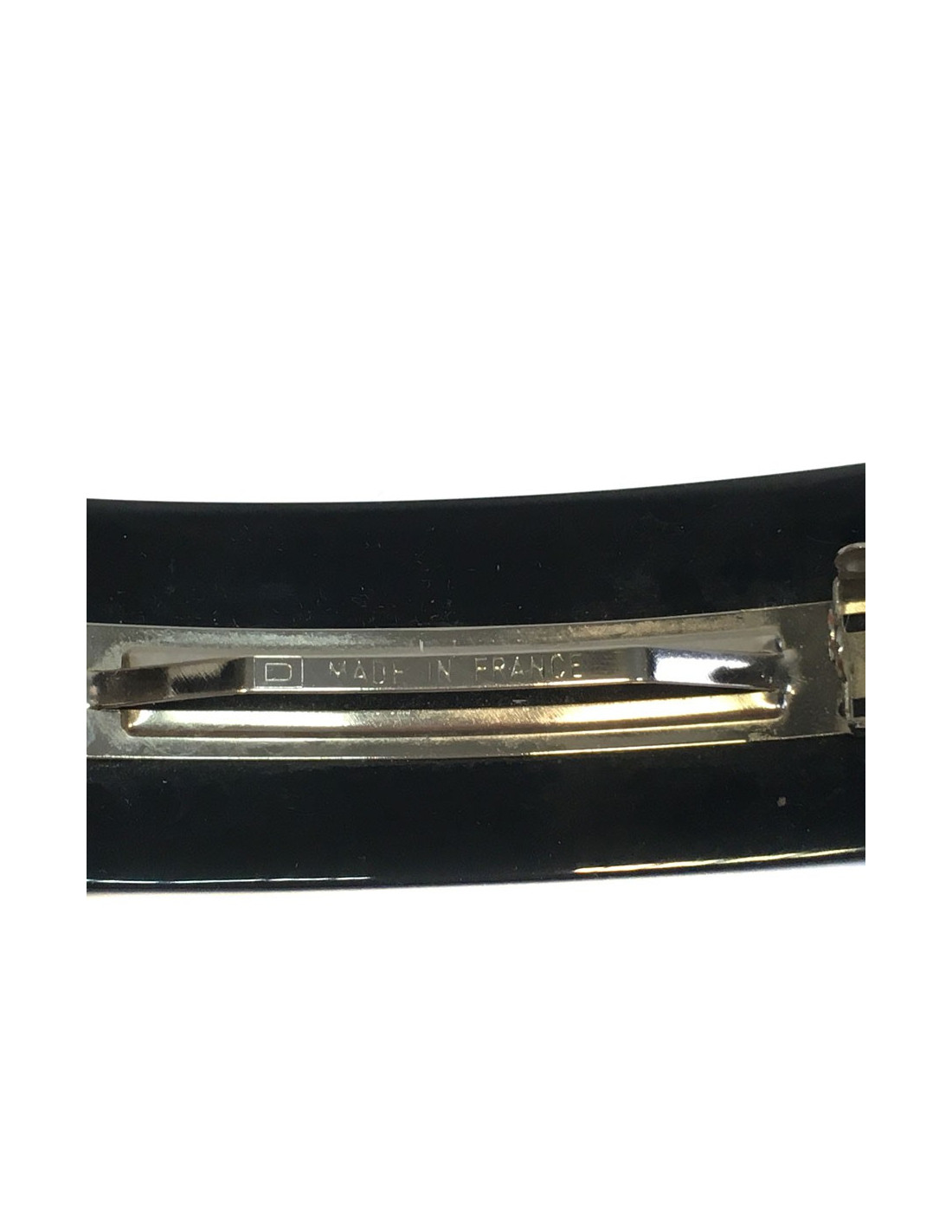 Large barrette à cheveux CHANEL en plexi noir avec des inclusions de multitudes de CC dorés. Légères microrayures sur la barrette. Le plexi est un peu passé par endroits. En bon état général. Fabriqué en France.