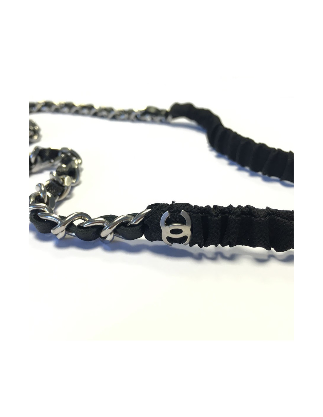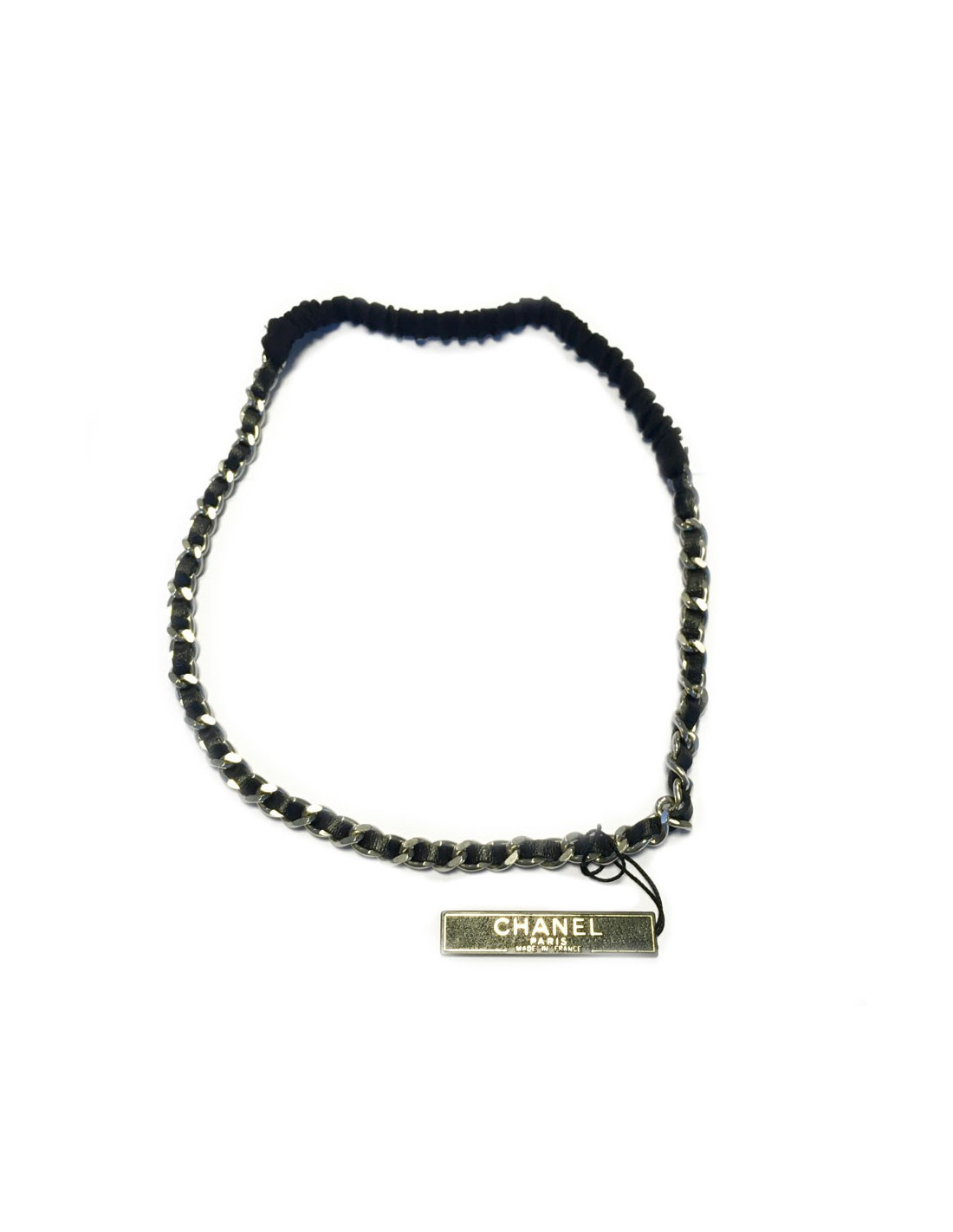 Magnifique serre-tête ou bijou de tête CHANEL. Chaîne en métal argenté et cuir noir entrelacé. Bandeau élastique recouvert de tissu noir. Un CC argenté sur bord de l'élastique. Jamais porté.