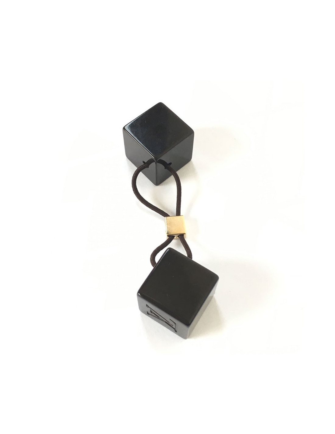 Elastique marron et 2 cubes marrons. Initiales de la marque inscrite sur chacun des cubes.
