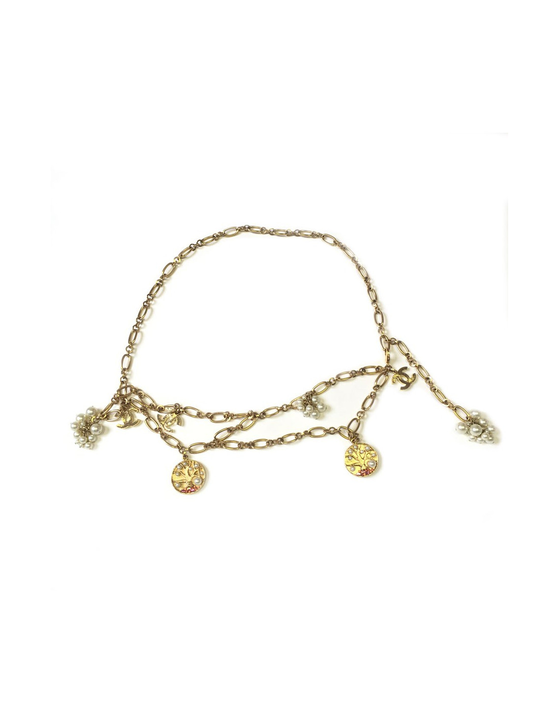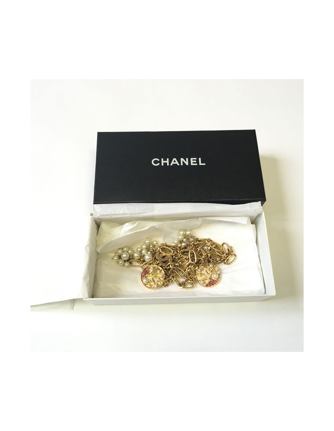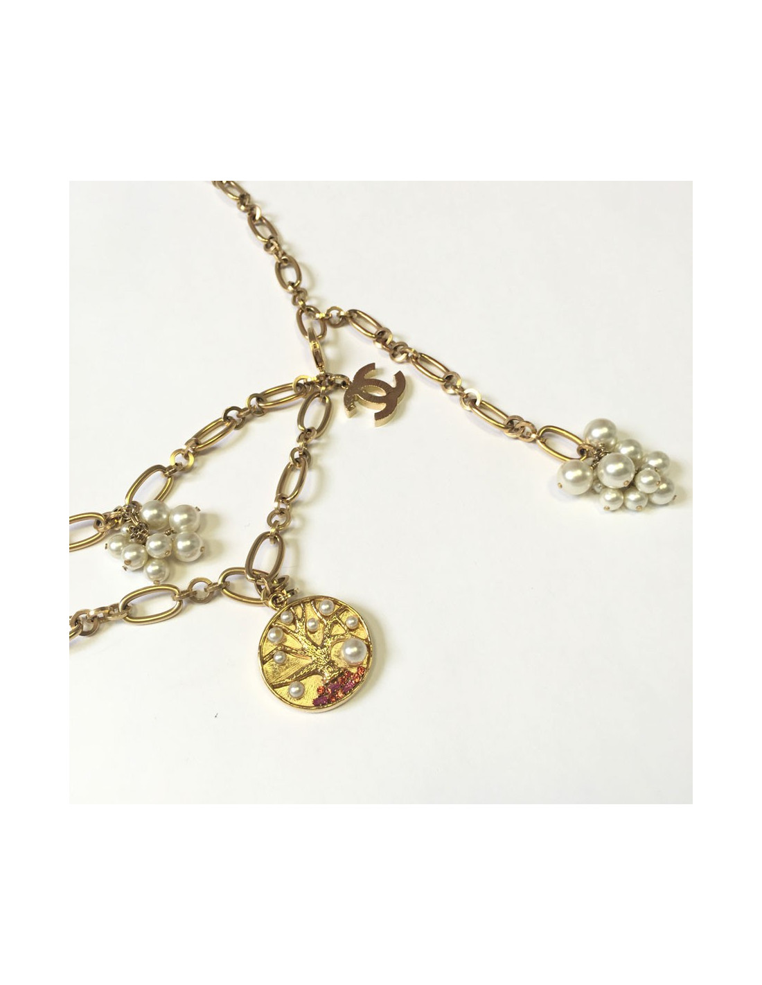 Superbe Ceinture sautoir CHANEL en chaîne dorée, petites grappes de perles nacrées, charms ronds avec un motif arbre orné de perles nacrées et strass roses et des CC dorés. L'hologramme chanel est gravé sur le mousqueton.