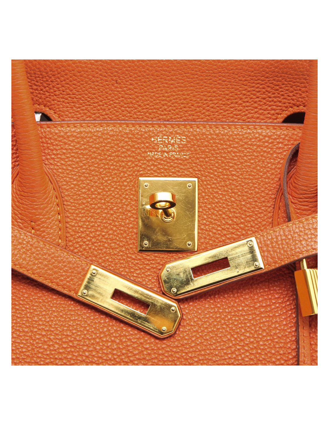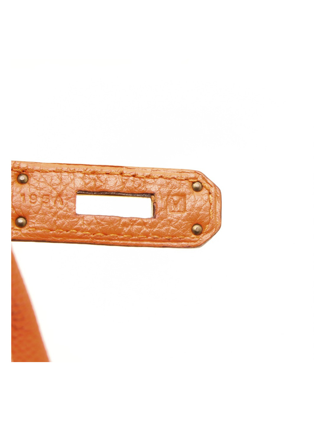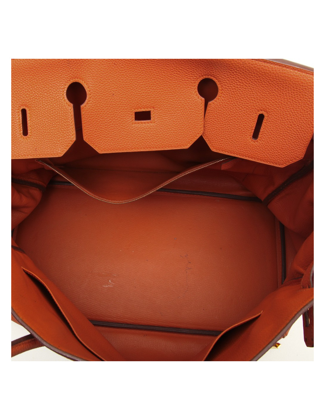 Sac 'Birkin 40' Hermès en cuir togo orange. Bijouterie dorée. Lettre M Année 2009. Tirette, clochette, cadenas et clefs. Made in France. En très bon état. Petites pointes de stylo à l'intérieur mais très peu visibles.