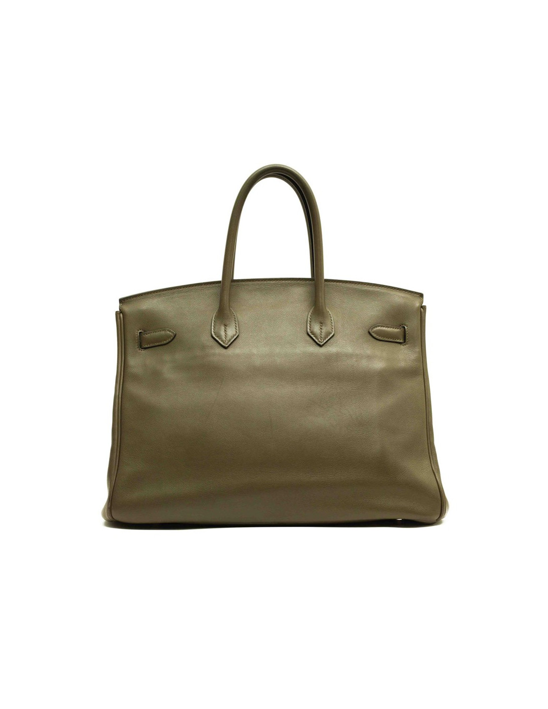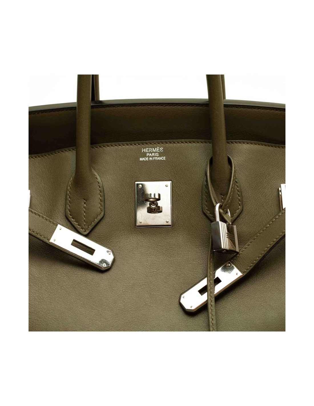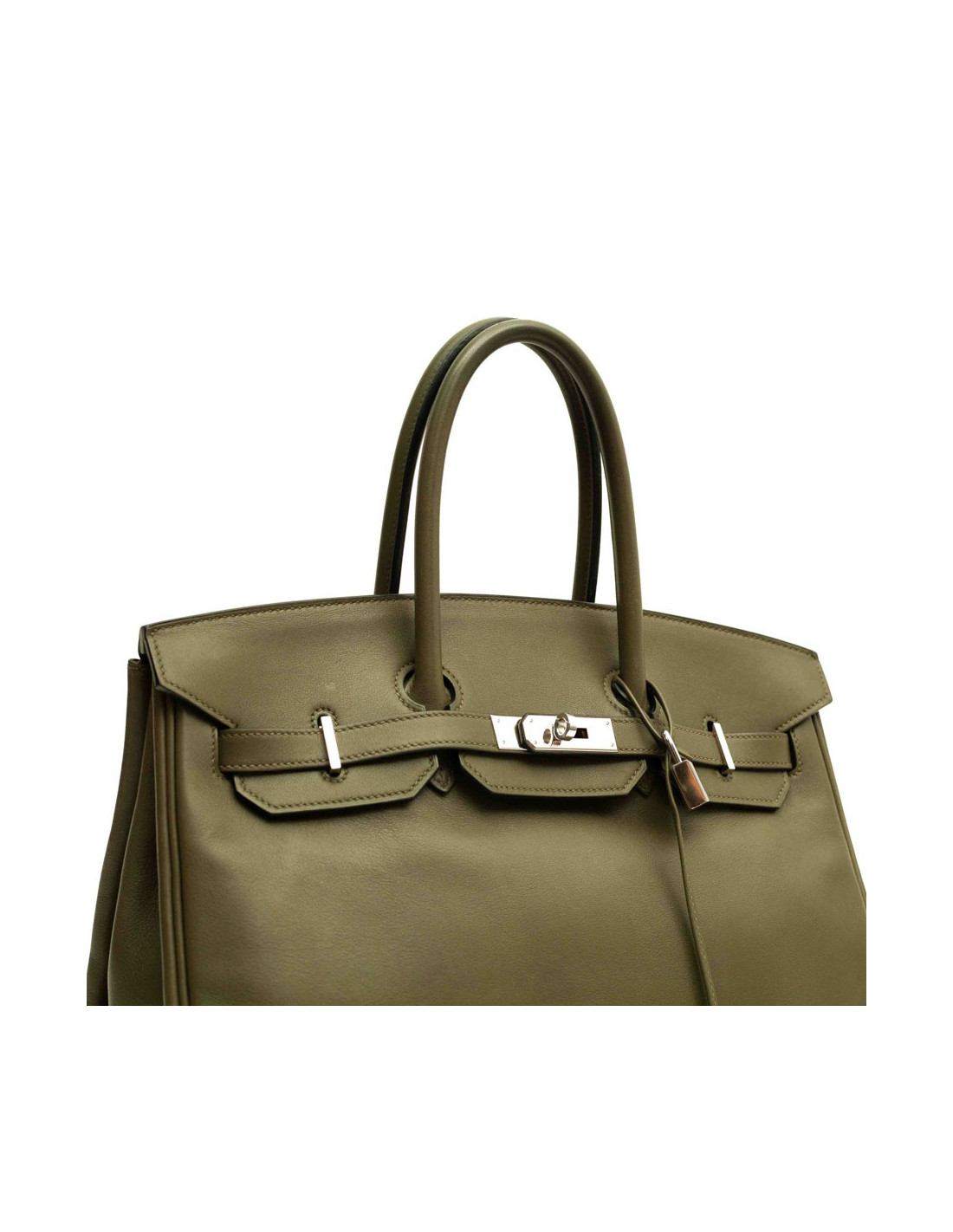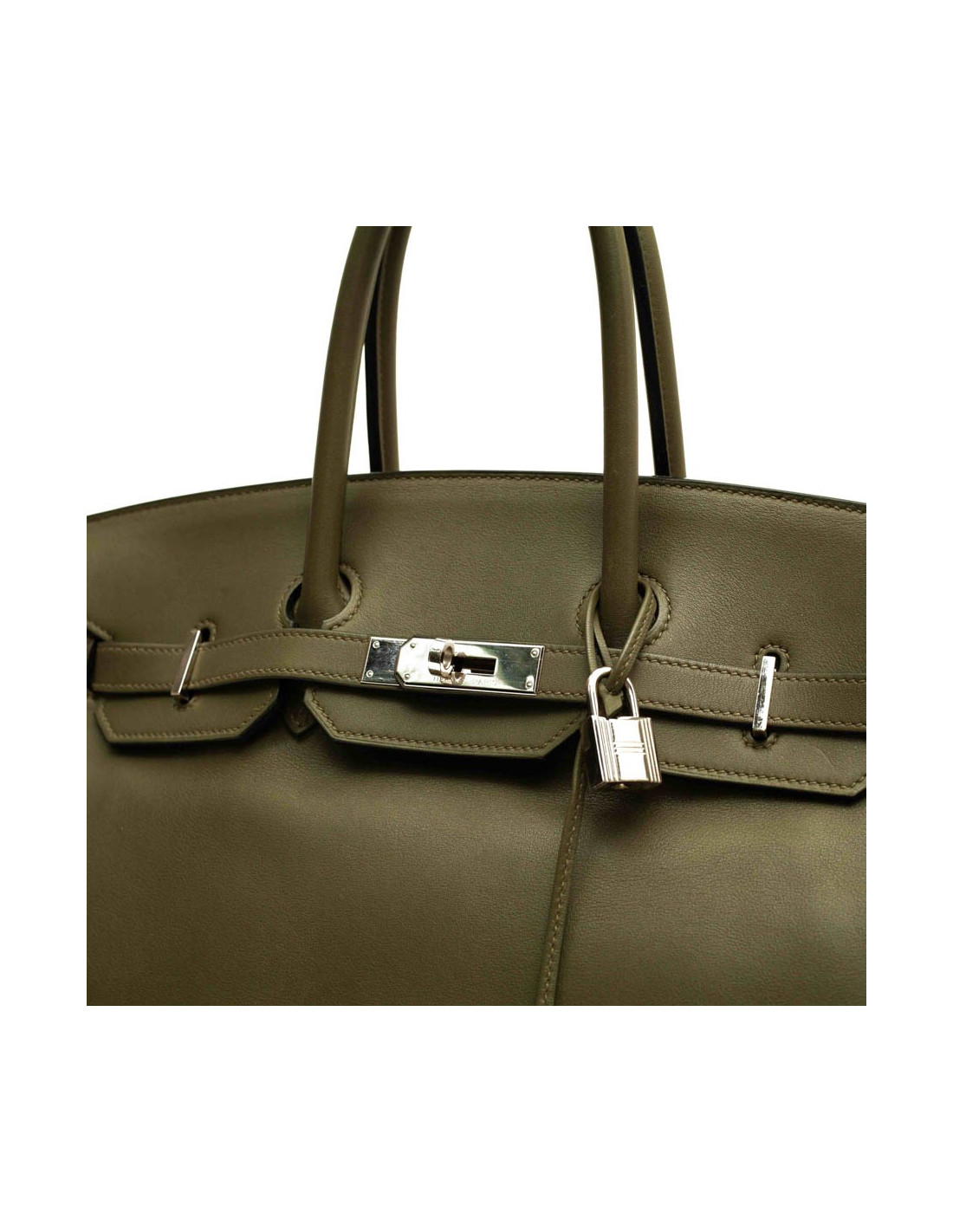 Sac d'occasion HERMES taille 35 en cuir Swift vert olive, doublure en cuir. La bijouterie est en métal argent palladié. Il a sa tirette, clés et cadenas. De micro-rayures sont visibles sur l'accastillage. Il se raconte que le sac fut dessiné pour Jane Birkin par Jean Louis Dumas, lors d'un vol Paris-Londres en 1984. Elle souhaitait un sac plus grand et plus pratique que le Kelly mais plus petit qu'une valise pour faciliter sa vie de maman, tout en lui conservant un look élégant.