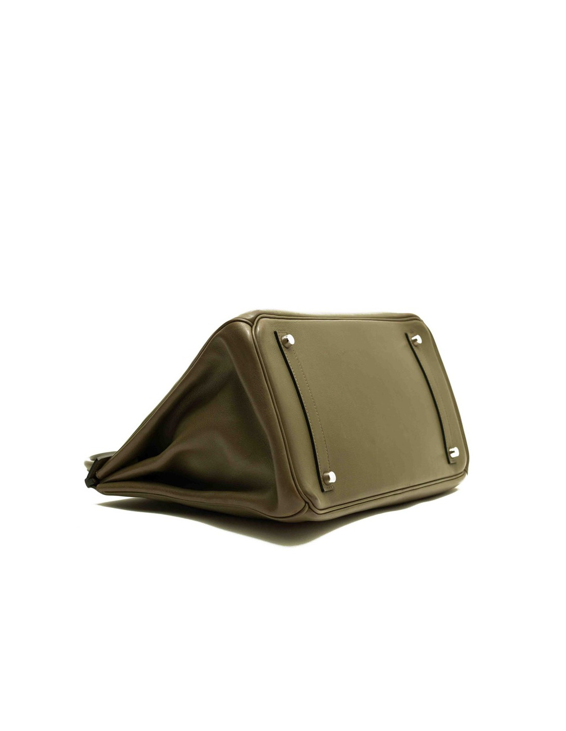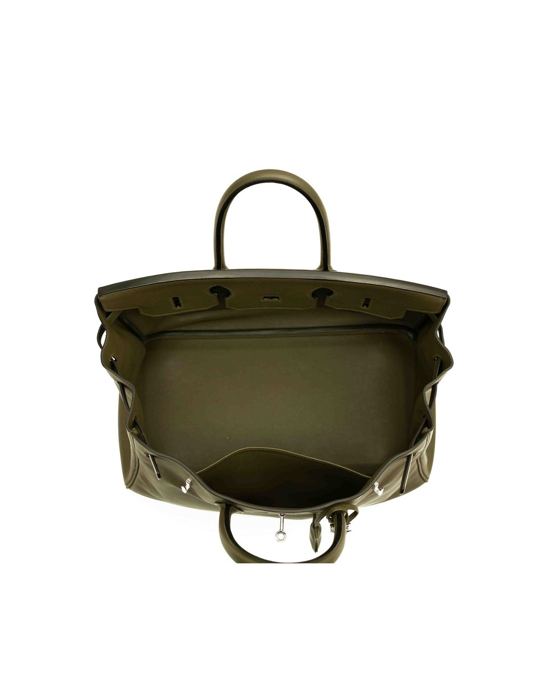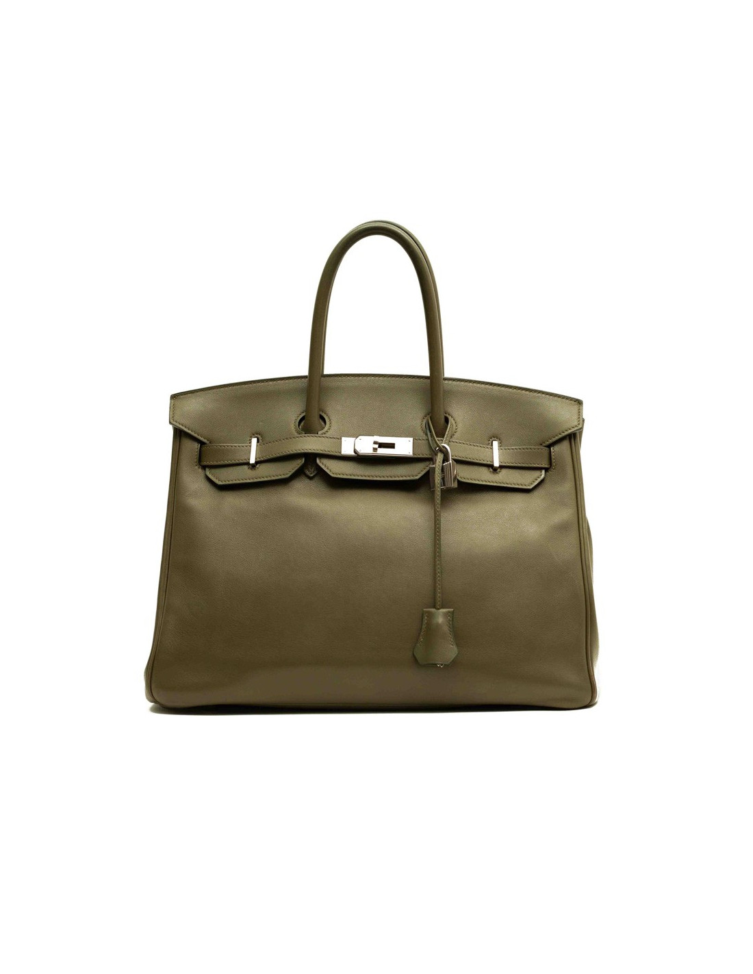 Sac d'occasion HERMES taille 35 en cuir Swift vert olive, doublure en cuir. La bijouterie est en métal argent palladié. Il a sa tirette, clés et cadenas. De micro-rayures sont visibles sur l'accastillage. Il se raconte que le sac fut dessiné pour Jane Birkin par Jean Louis Dumas, lors d'un vol Paris-Londres en 1984. Elle souhaitait un sac plus grand et plus pratique que le Kelly mais plus petit qu'une valise pour faciliter sa vie de maman, tout en lui conservant un look élégant.