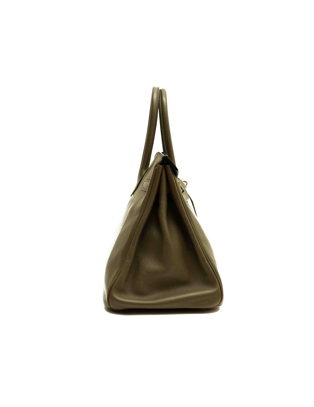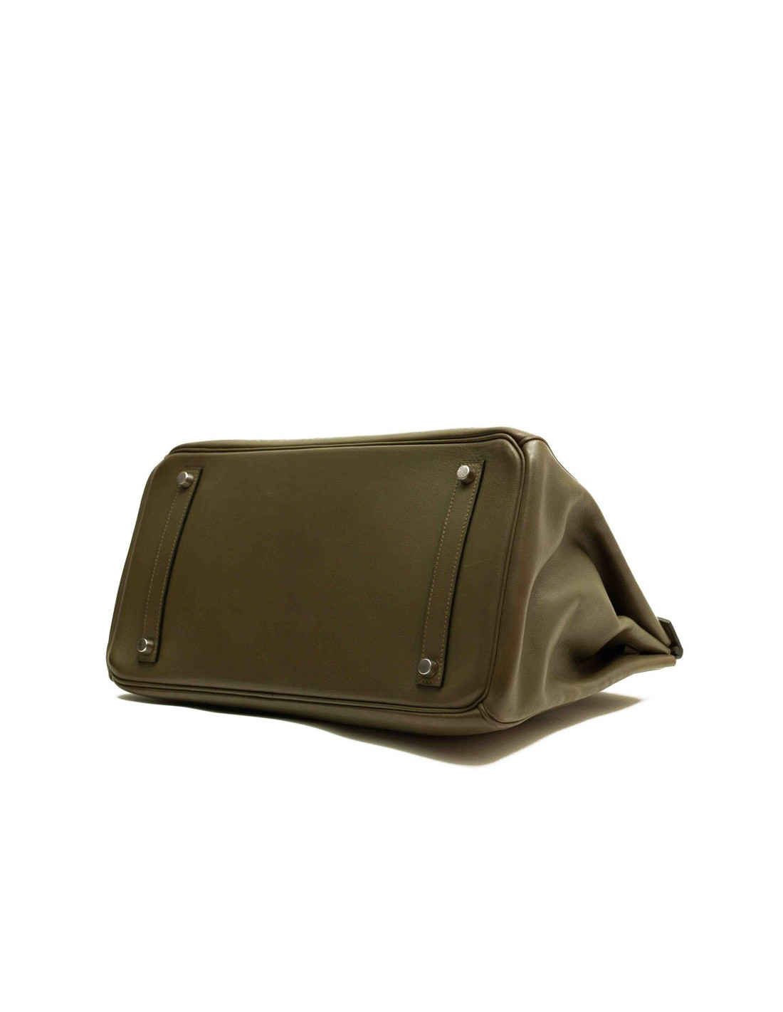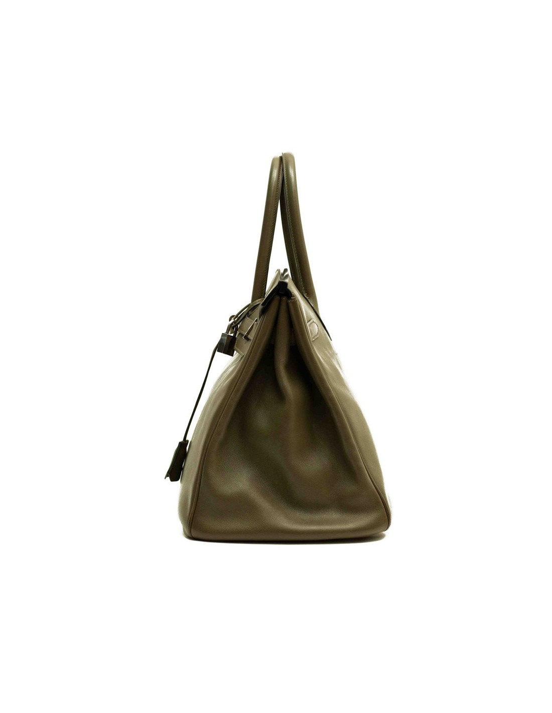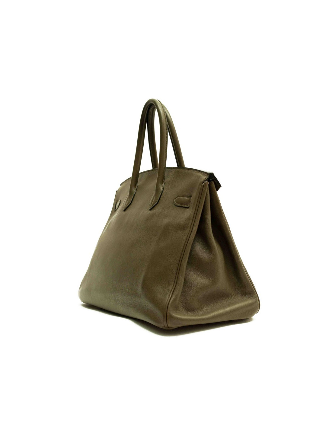 Sac d'occasion HERMES taille 35 en cuir Swift vert olive, doublure en cuir. La bijouterie est en métal argent palladié. Il a sa tirette, clés et cadenas. De micro-rayures sont visibles sur l'accastillage. Il se raconte que le sac fut dessiné pour Jane Birkin par Jean Louis Dumas, lors d'un vol Paris-Londres en 1984. Elle souhaitait un sac plus grand et plus pratique que le Kelly mais plus petit qu'une valise pour faciliter sa vie de maman, tout en lui conservant un look élégant.