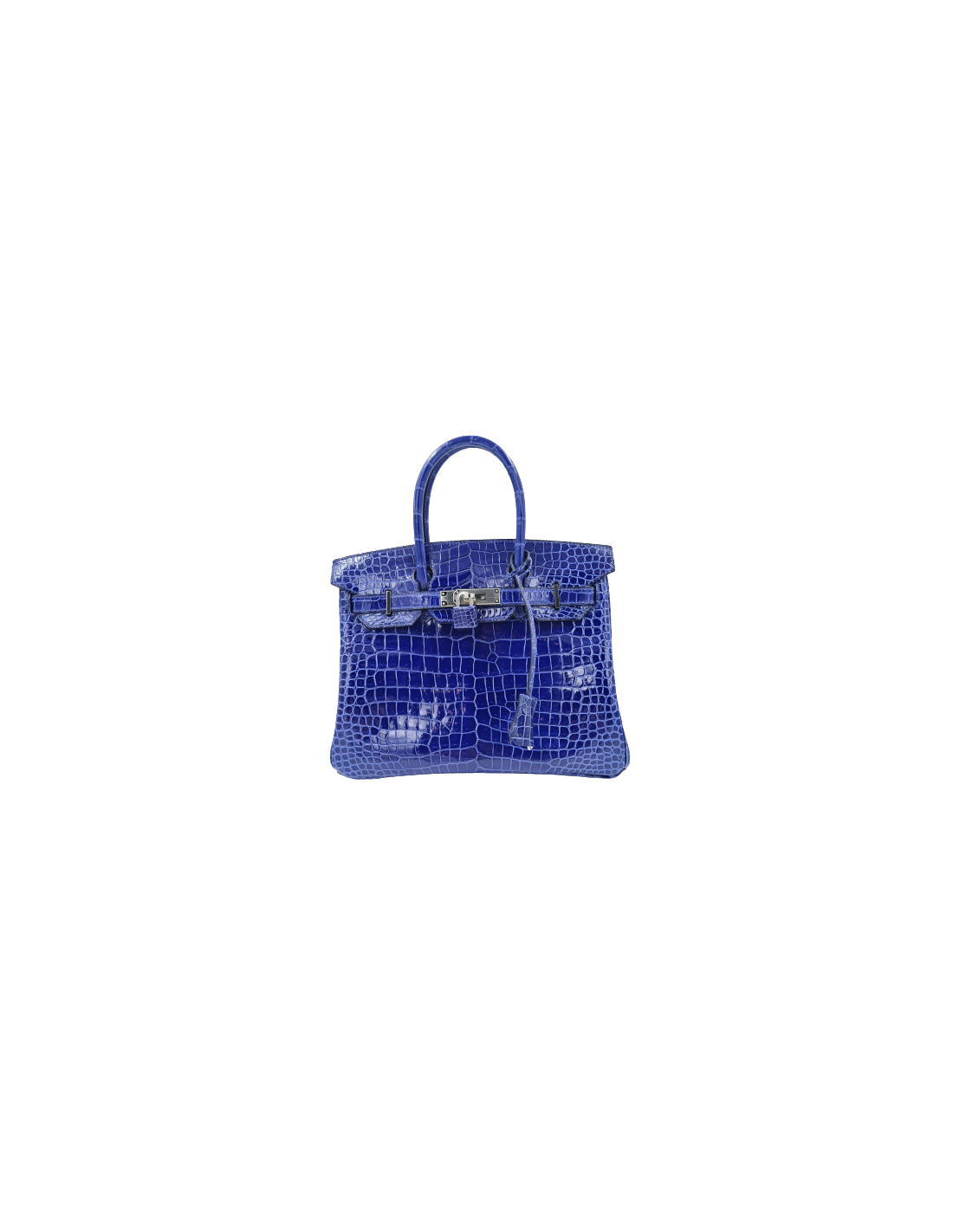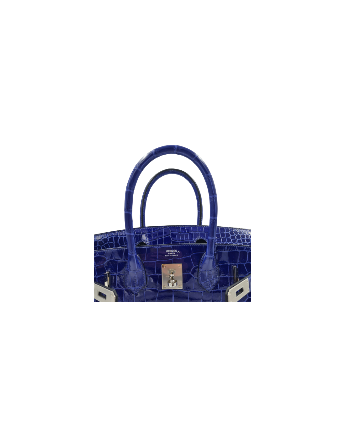 Ce magnifique sac Birkin 30 est en crocodile bleu électrique. Les attributs sont en métal argenté, présence des plastiques de protection sur la bijouterie.