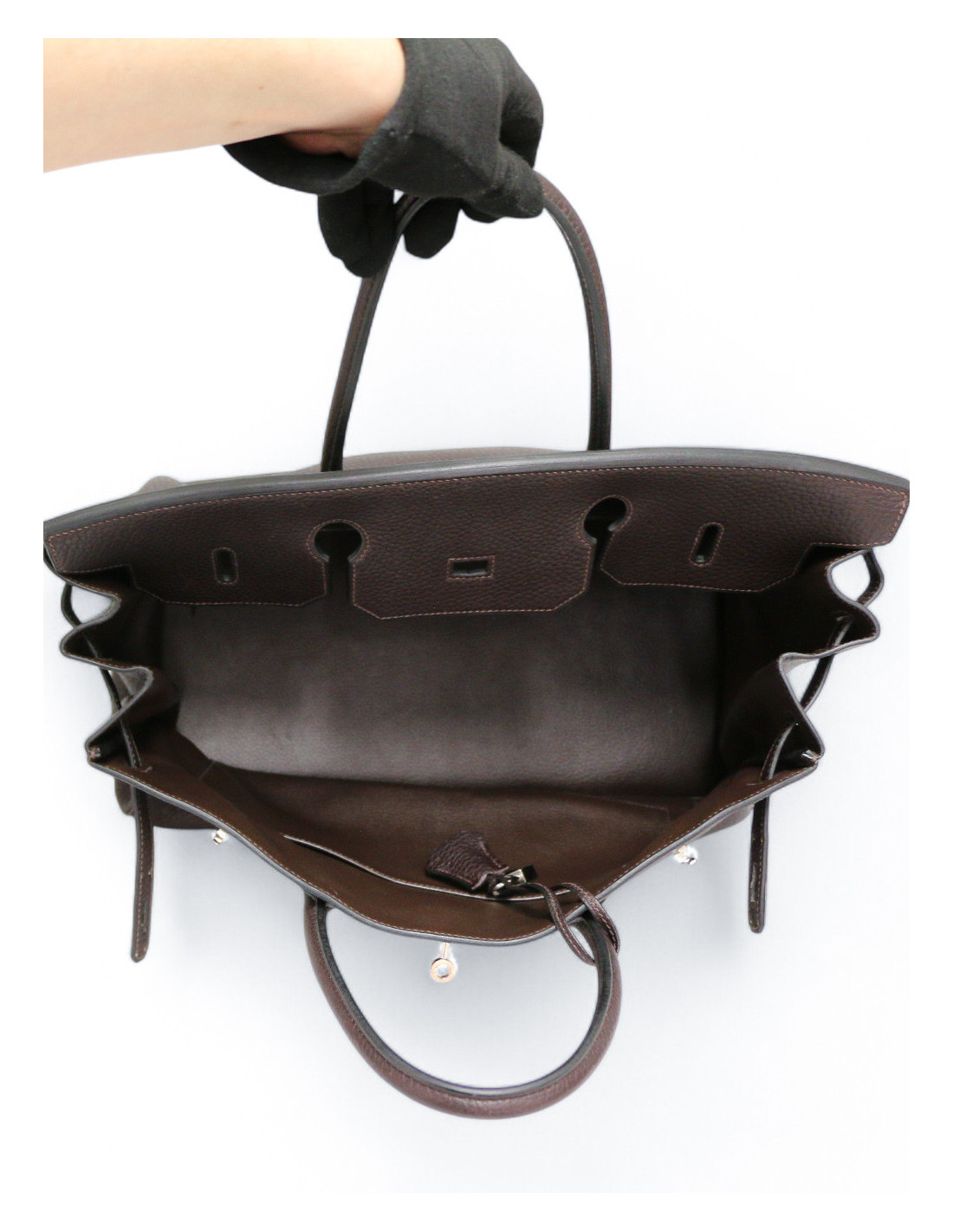 Détails : le sac sera livré avec sa tirette, clochette, clé (x2) et cadenas. Les coins du sac ne présentent aucune usure. Il se porte à la main. Un grand espace de rangement avec deux poches plaquées dont une zippée. La bijouterie est légèrement piquée (facilement remplaçable chez Hermès).
