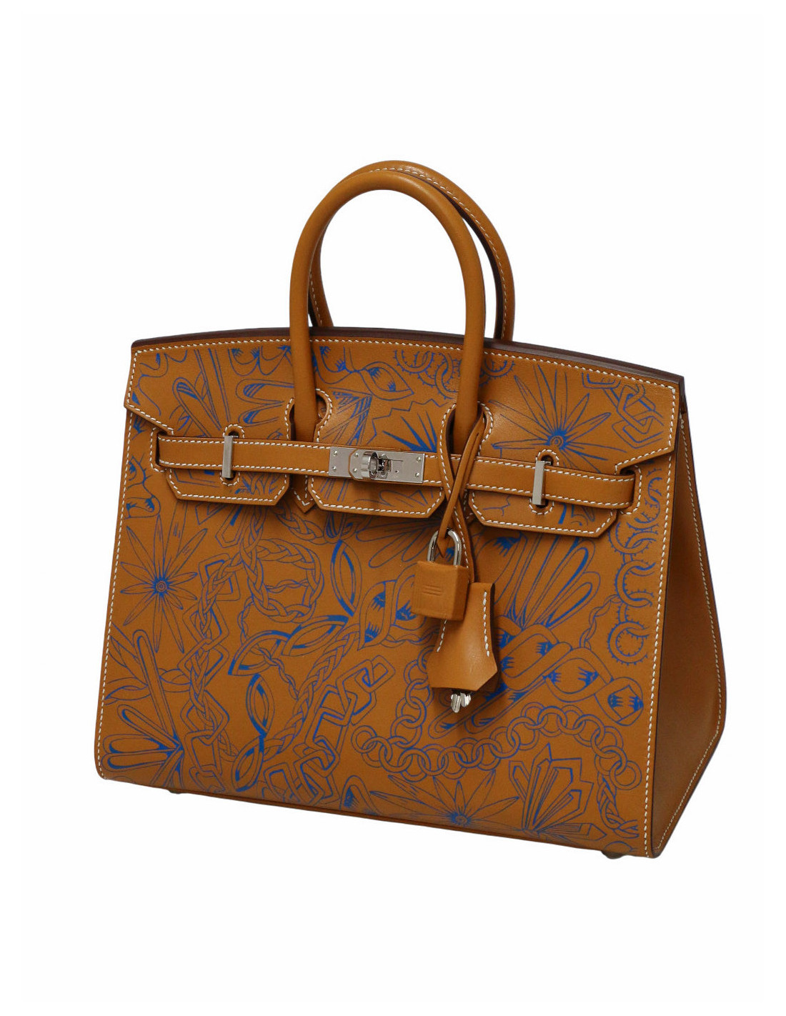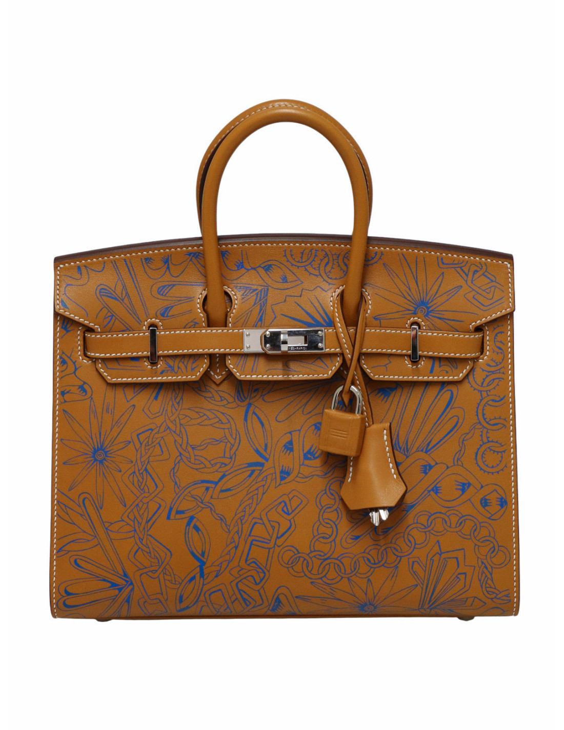 Ce modèle Birkin 25 Maillons en Chaîne, confectionné en 2023, se distingue par son design unique et son caractère hautement collectible. Réalisé en cuir butler, il est sublimé par un imprimé graphique bleu représentant des maillons de chaîne entrelacés et des motifs floraux abstraits, signature artistique forte et recherchée.