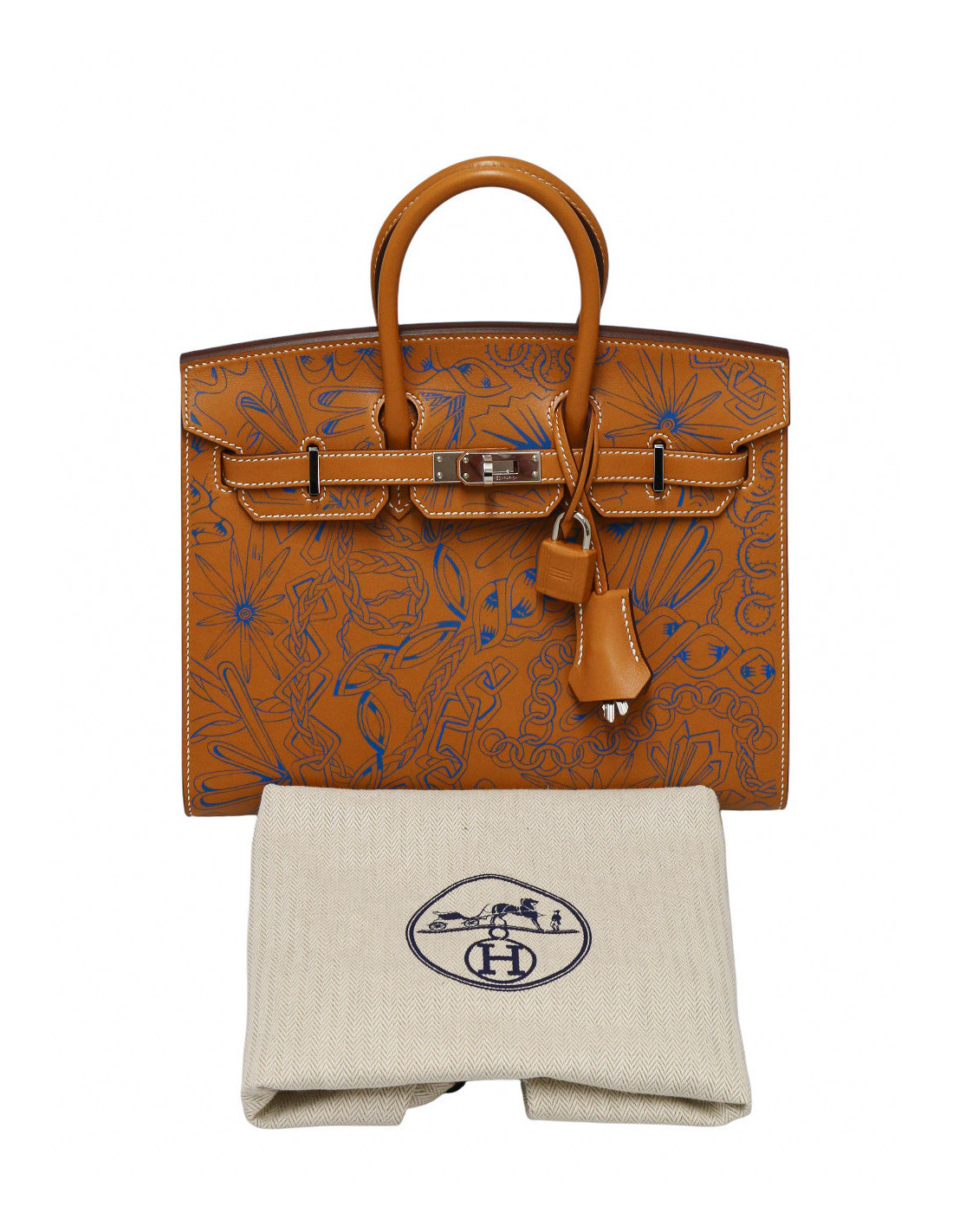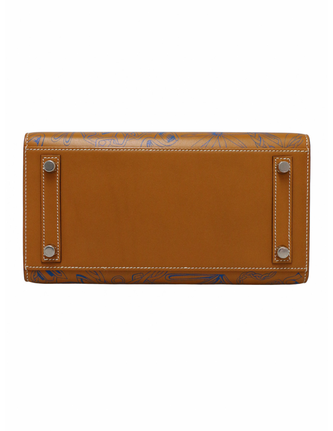 La bijouterie palladium apporte une touche moderne et lumineuse, créant un contraste raffiné avec la teinte chaude du cuir naturel et l’imprimé bleu. Les surpiqûres blanches contrastantes, les poignées structurées et le fermoir emblématique témoignent du savoir-faire artisanal d’Hermès et de l’excellence de sa maroquinerie de luxe.