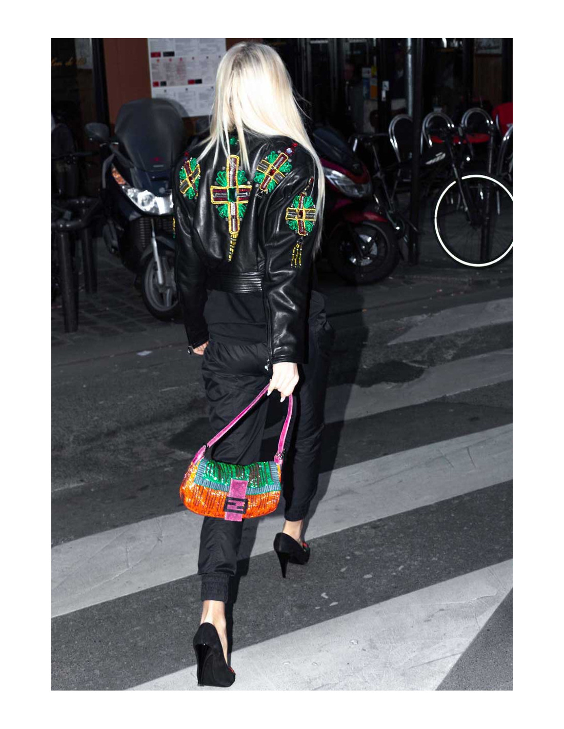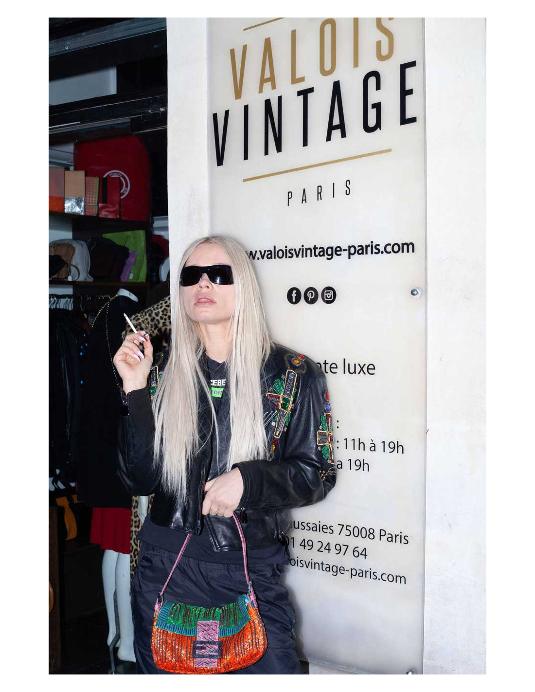 Pièce exceptionnelle Gianni Versace, une pièce collector qui finira dans un musée si elle n’est pas achetée avant par l’une d’entre vous! Il s’agit d’une veste en cuir noir à manches raglans, recouvertes de broderies et de pierres multicolores. À la taille elle est resserrée dans l’esprit d’un perfecto. La coupe est sublime. L’intérieur est doublé et est dans un état parfait, comme l’ensemble de ce blouson d’ailleurs, il semblerait qu’il n’ait jamais été porté ou vraiment très peu.