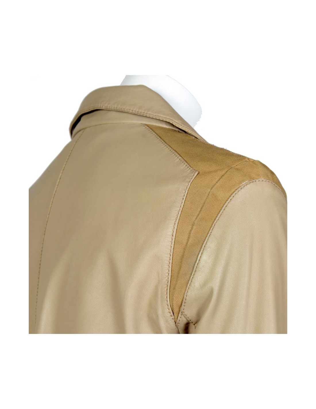 Blouson Prada en cuir d'agneau beige. Taille 44 Italien équivaut à un 40 français. Fermeture zippée. Il est ressérré en bas par un ruban. Une poche plaquée de chaque côté. En très bon état.