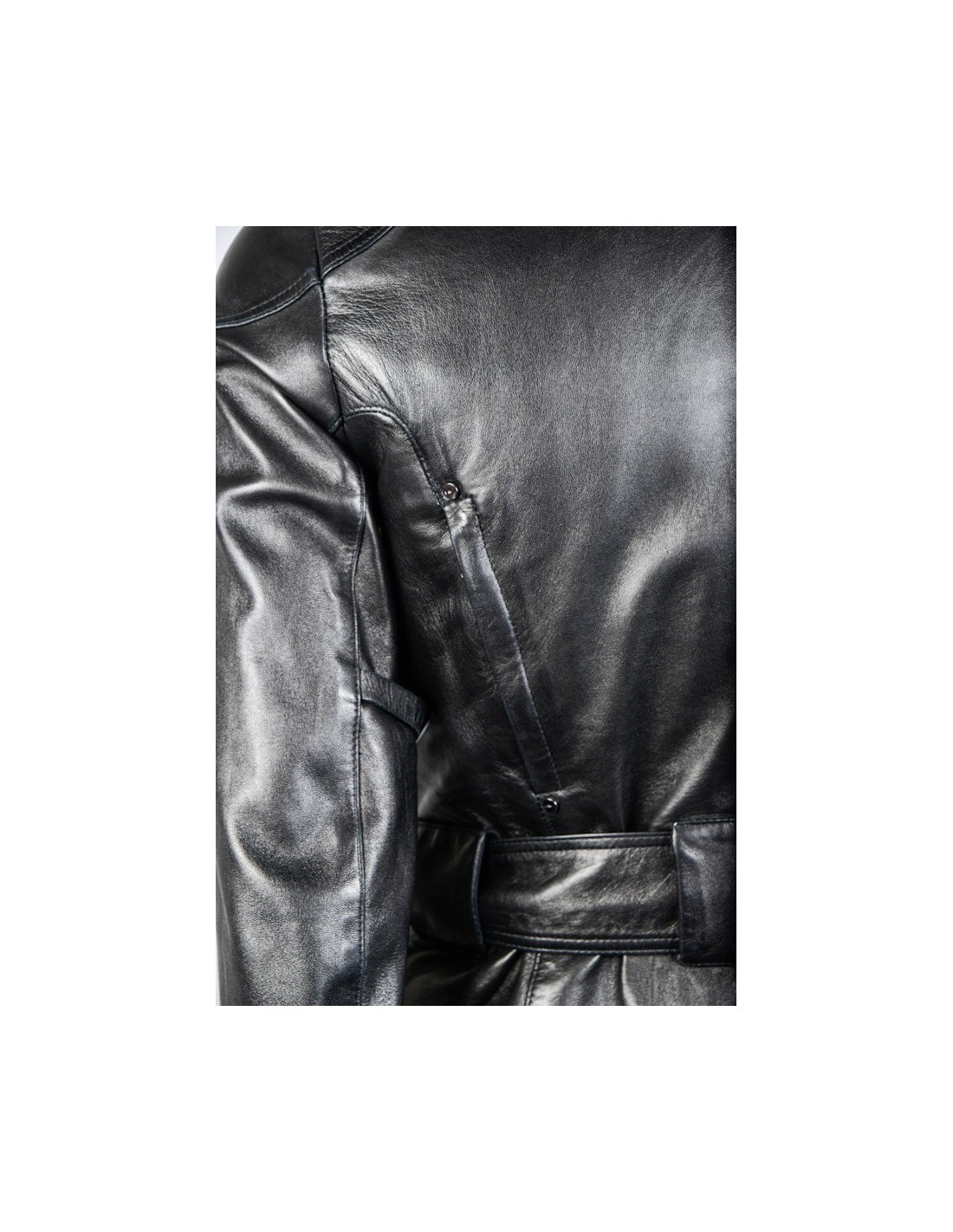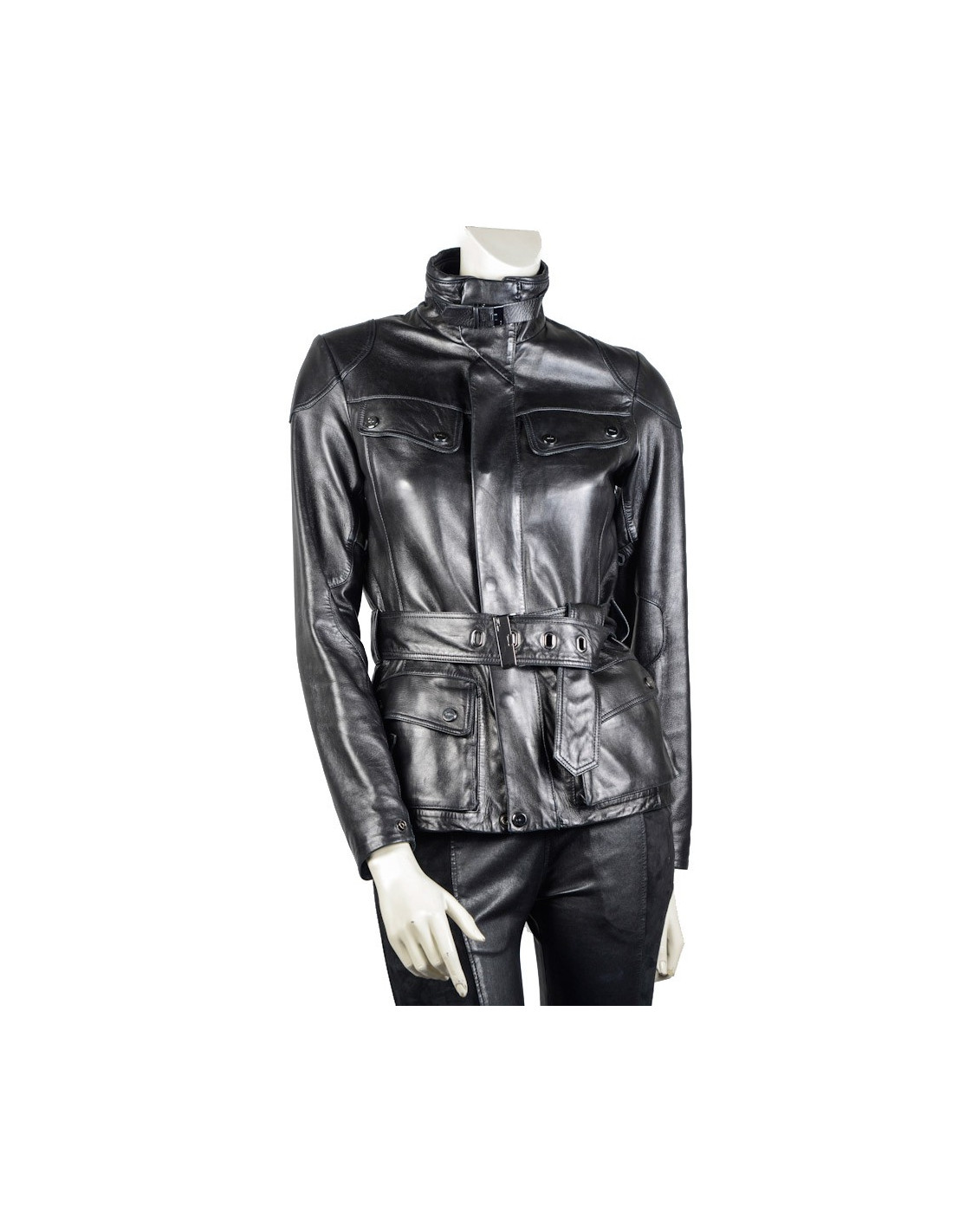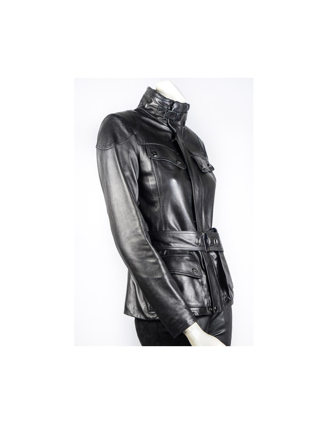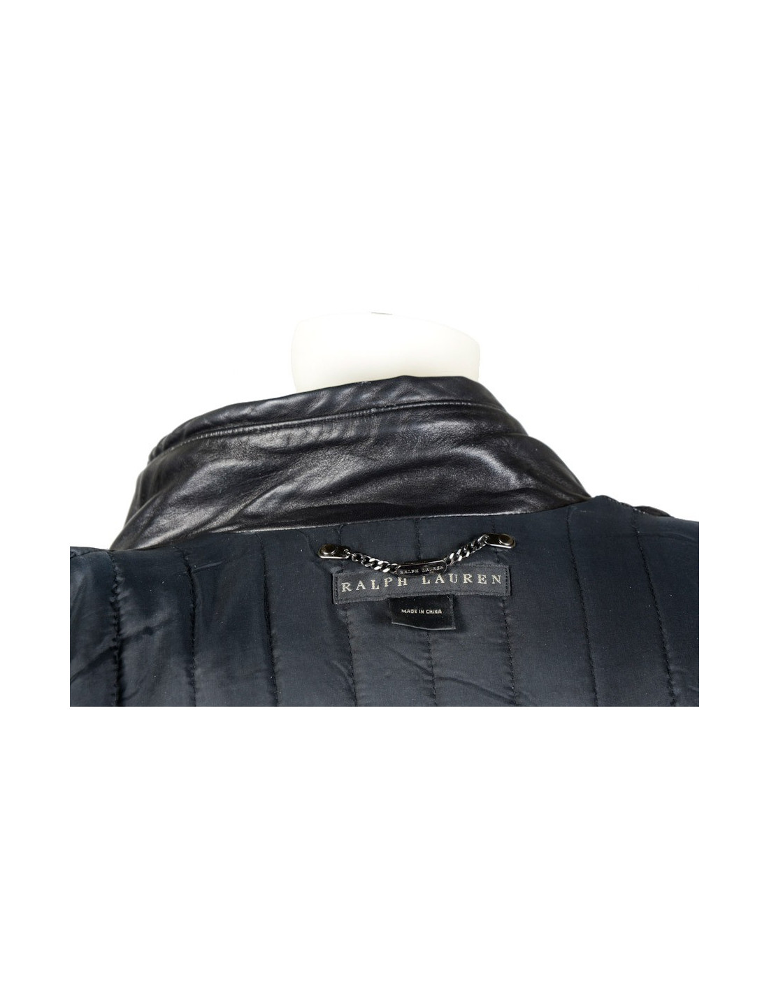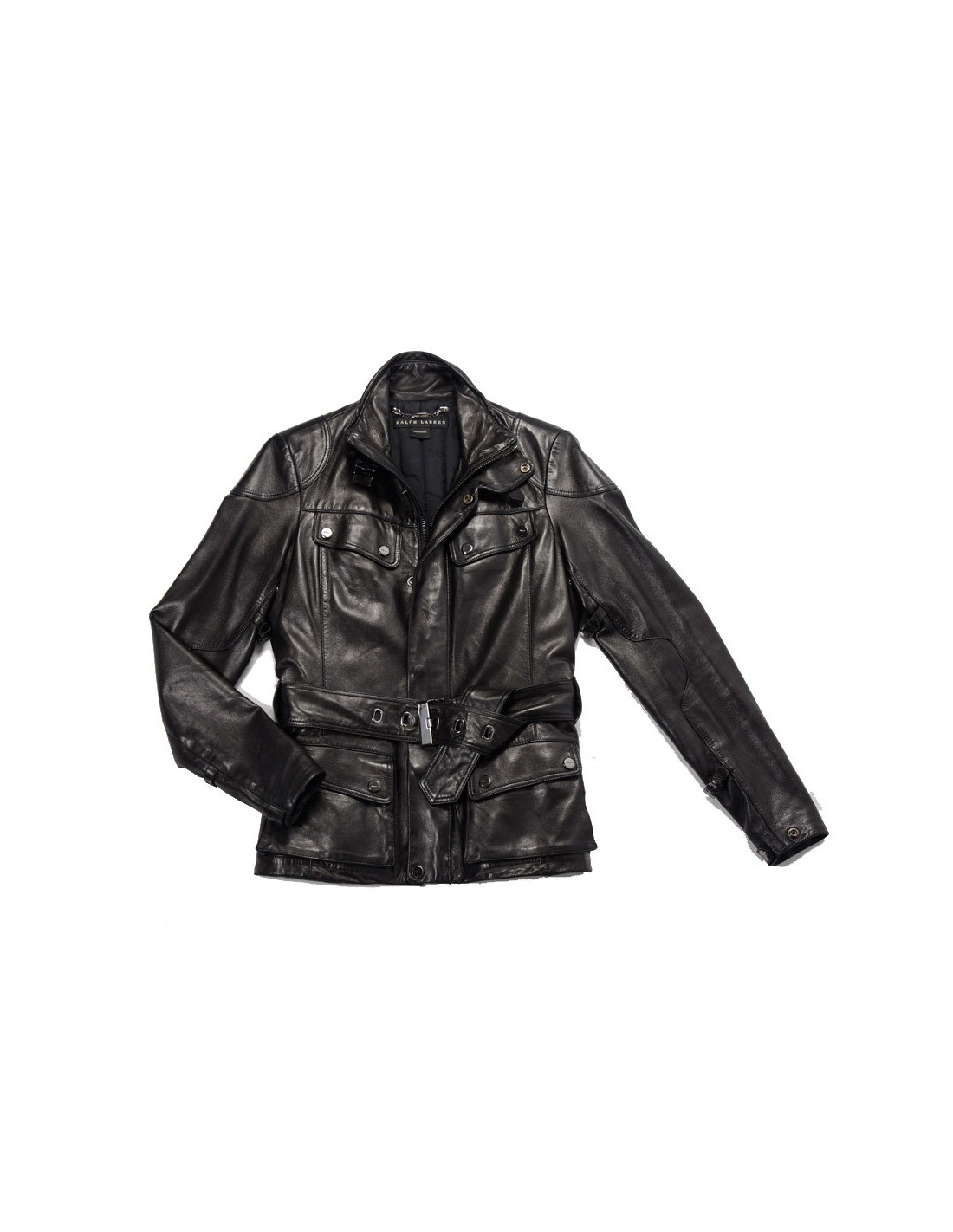 Blouson Ralph Lauren en cuir d'agneau noir. Doublure moltonnée. Fermeture zippée et pression. 4 poches plaquées à l'avant. Une ceinture reglable vient resserrer la taille. Taille 2. En très bon état.