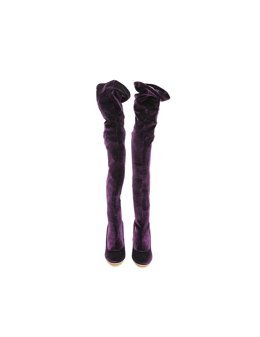 Ces cuissardes d'occasion SERFIO ROSSI sont en velours stretch de couleur prune. C'est une taille 36. La Matière est élastique et stretch ce qui lui permet d'épouser la forme de la jambe. L'intérieur est de couleur prune également. Les semelles sont en cuir. Elles n'ont jamais été portées.