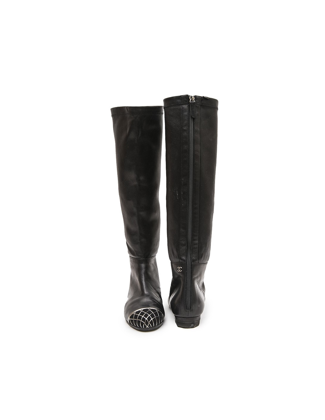 Bottes Chanel en cuir d'agneau lisse noir. Taille 37. Le bout en veau velours et grille en métal argentée. En très bon état.