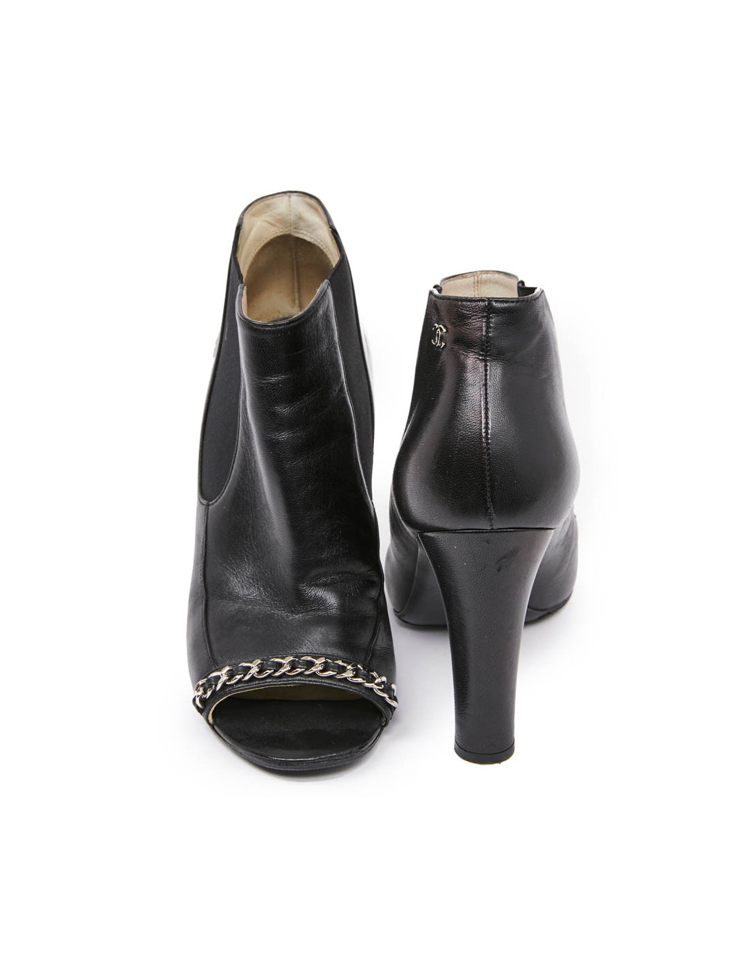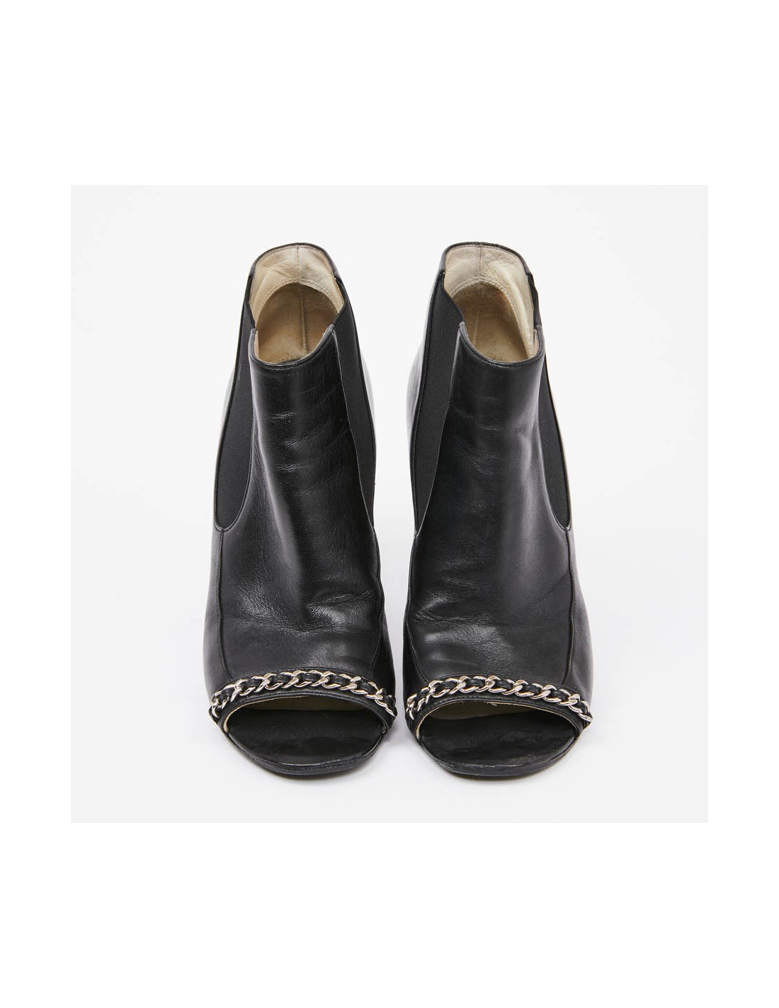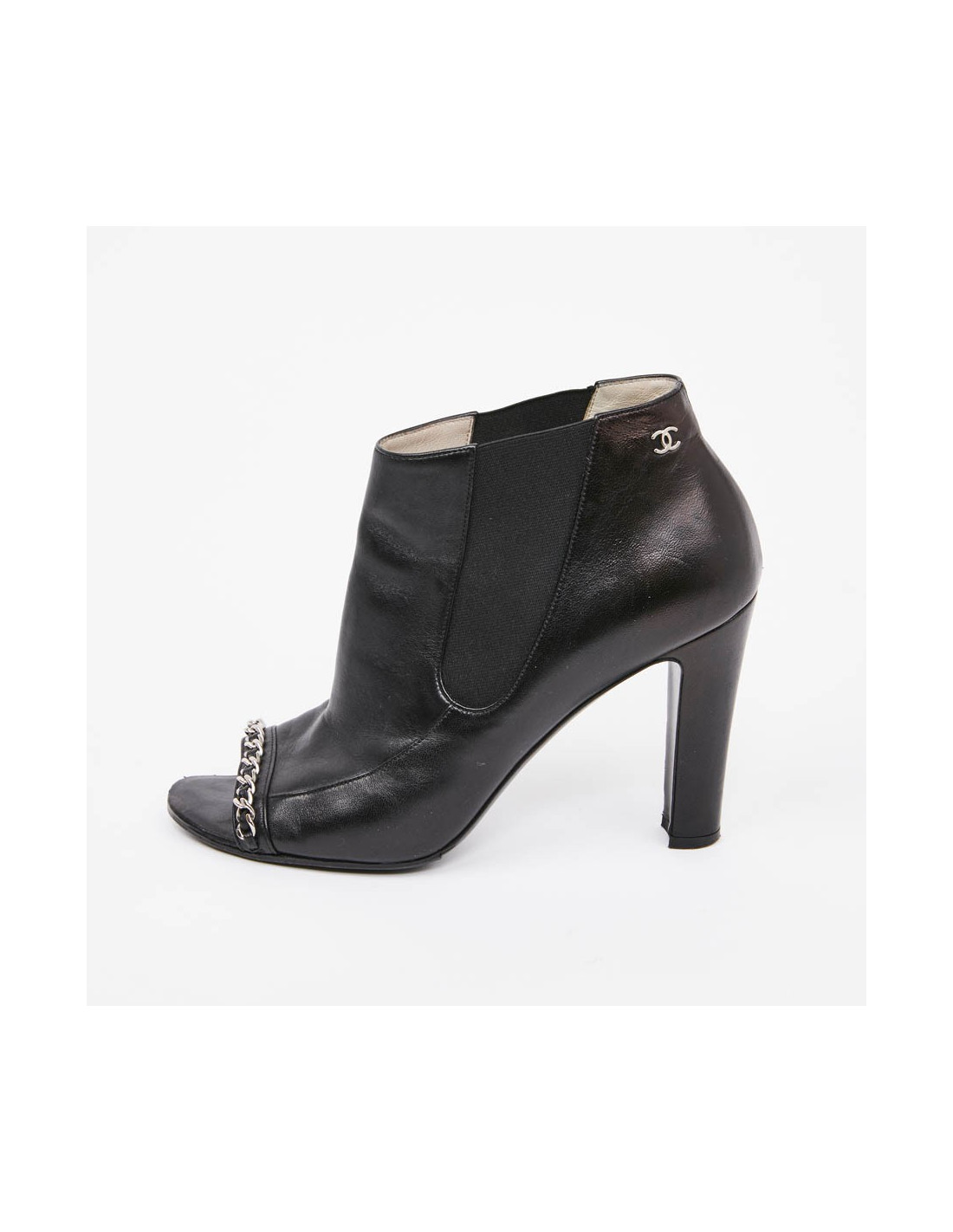 Cette belle paire de boots d'occasion CHANEL est en cuir d'agneau lisse noir. Elles sont ouvertes à l'avant avec une petite chaine entrelacée de cuir. Elles sont en très bon état, un topy a été rajouté