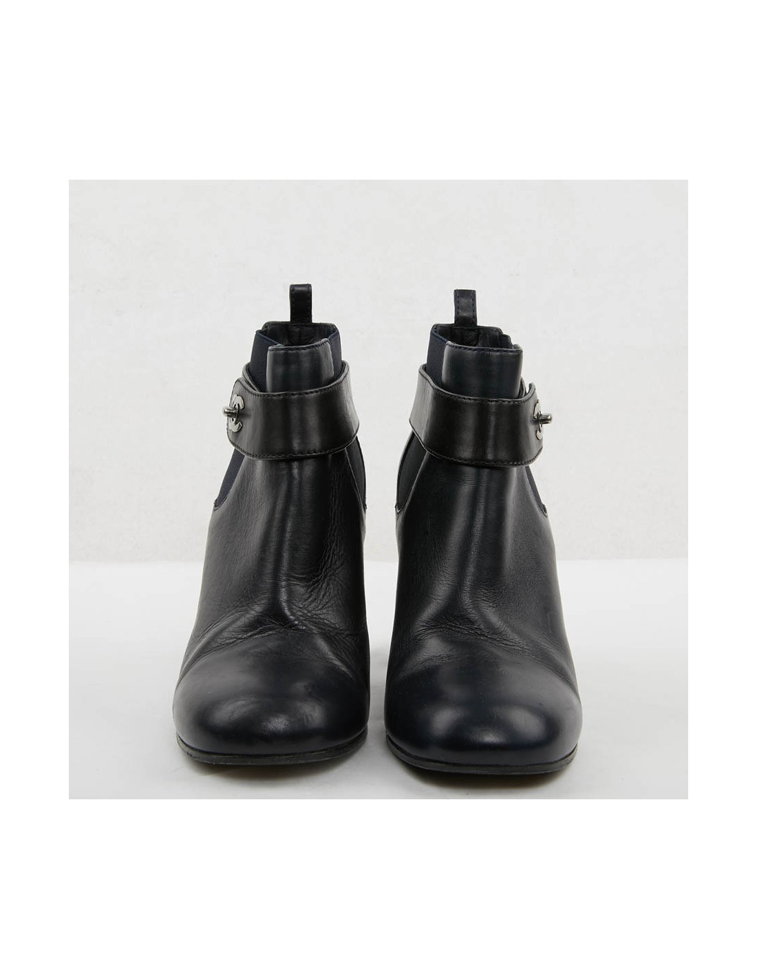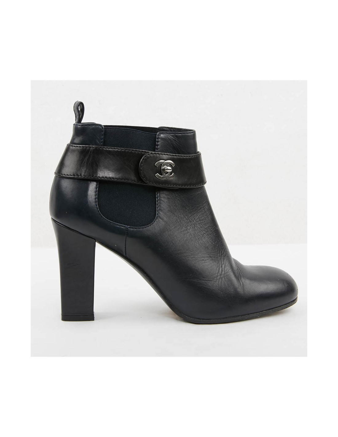 Ces boots à talon Chanel en cuir bleu foncé sont d'occasion. Leur talon épais permet une grande stabilité. Pour faciliter l'enfilage de la chaussure la languette avec le double "CC" se détache. Les renforts stretch sont en parfait état. Usures d'usage sur le cuir.