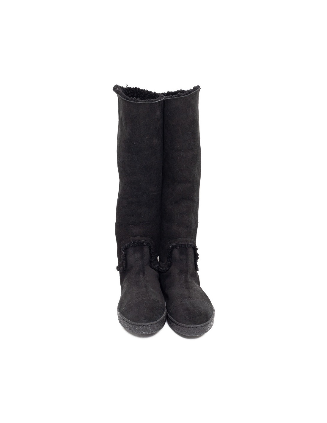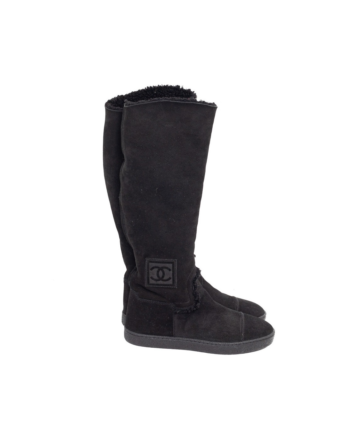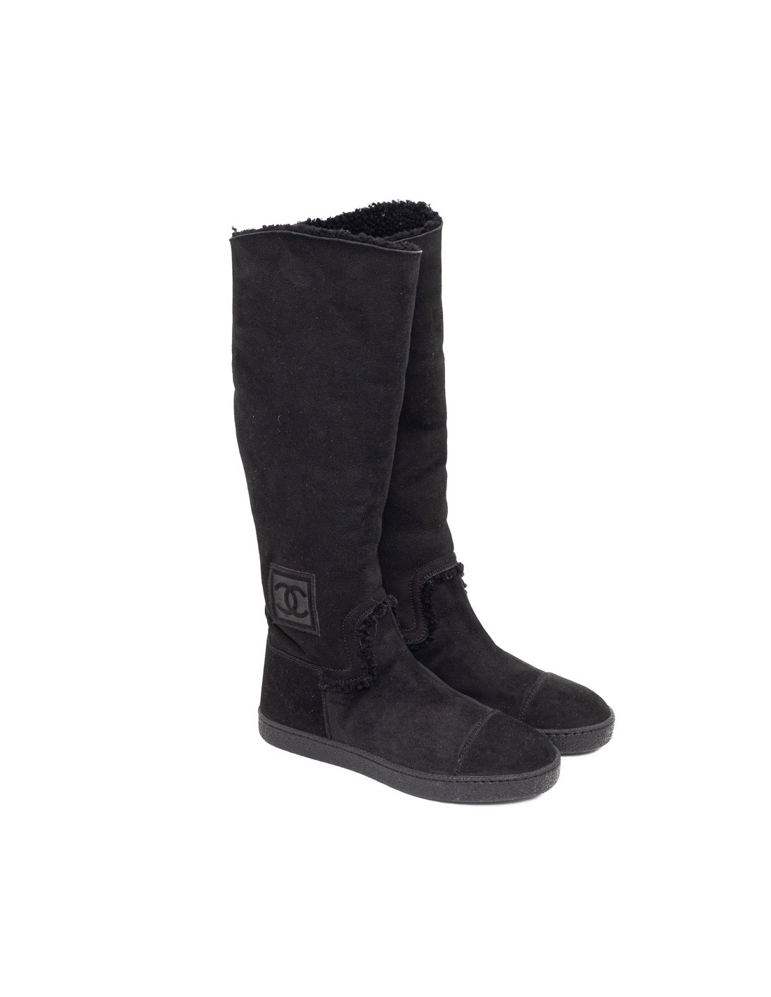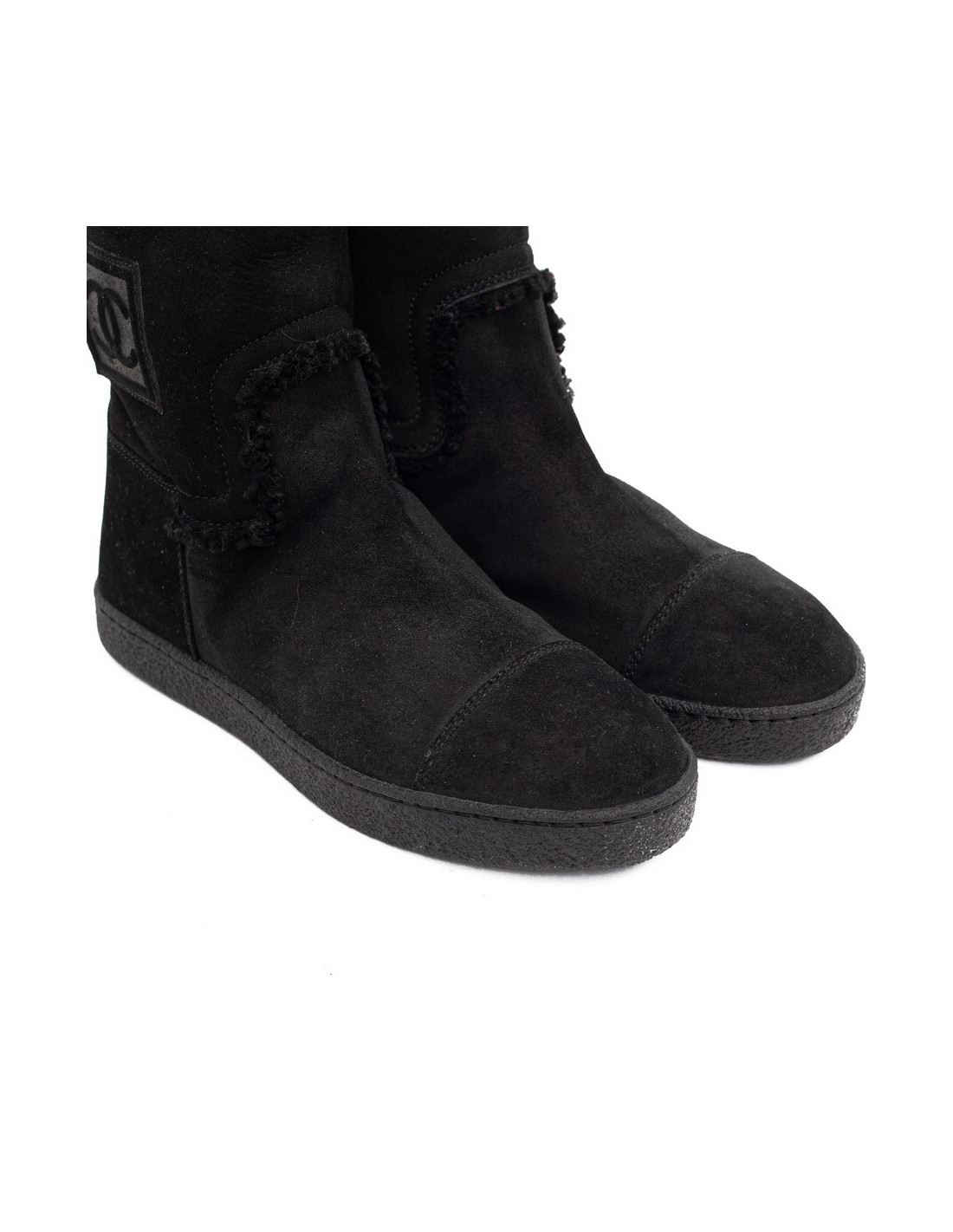 L'hiver est là. Très confortables, ceS bottes en peau retournée noire. Sur la partie basse le sigle CC. La semelle est en crêpe noire, signée "C H A N E L et CC". La partie de la chaussure est doublée également en peau retournée écrue. On peut aussi les porter à mi-mollet en faisant un revers.