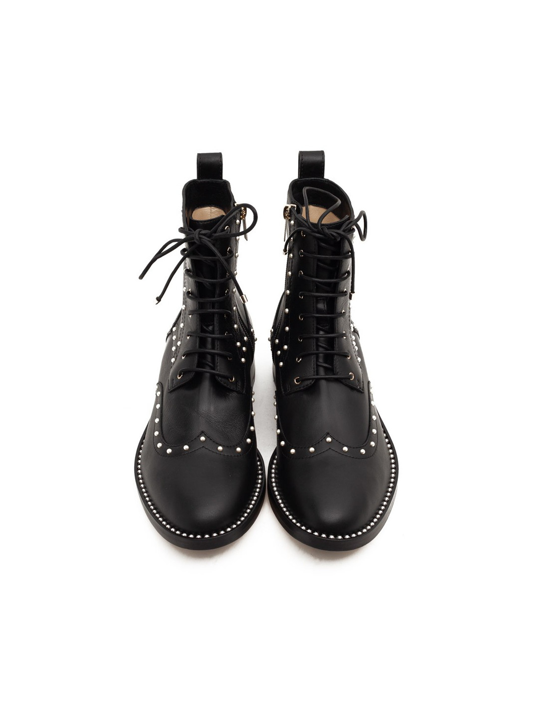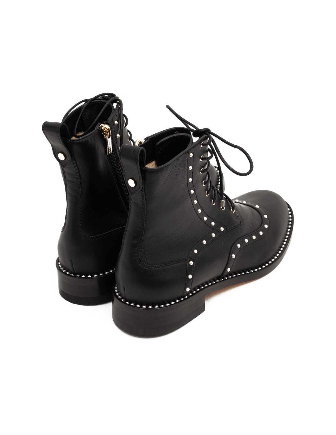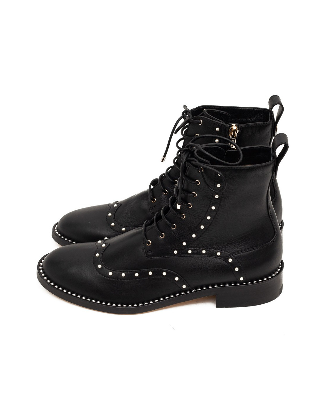 Bottines à lacets en cuir de veau noir perlé, avec une semelle en cuir beige et caoutchouc cranté en forme d'écaille de serpent. Elles sont dans une version rock et confortable. Elles ont une épaisse semelle en caoutchouc. Vous êtes parée pour tout l'hiver.