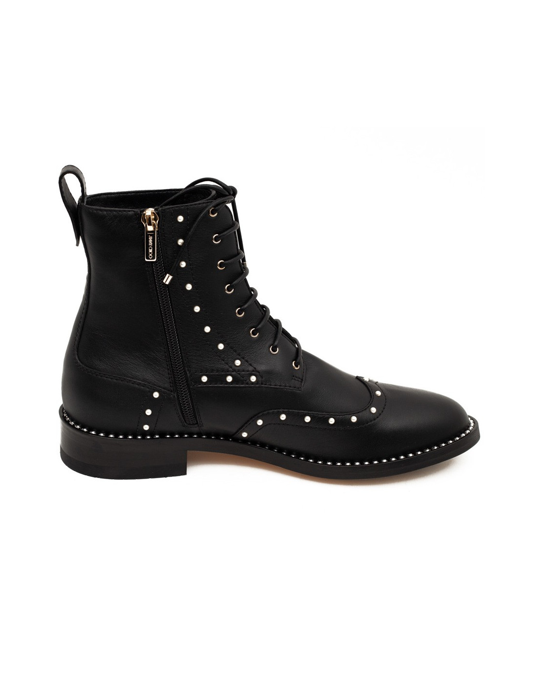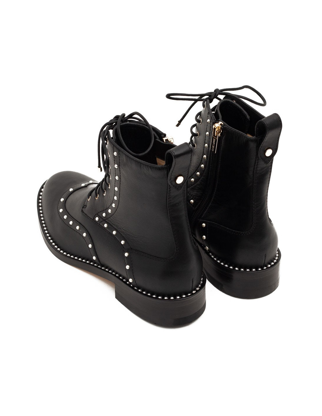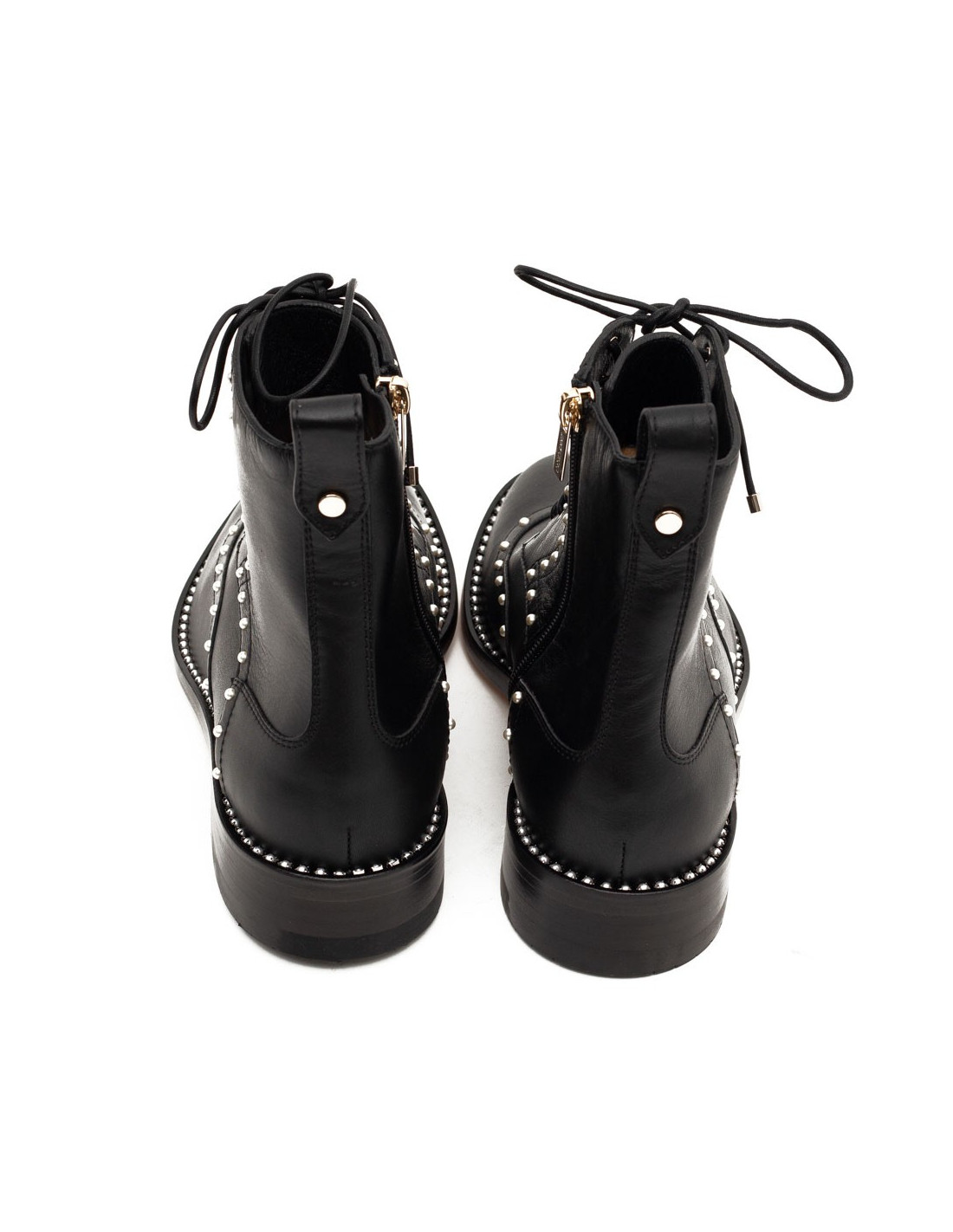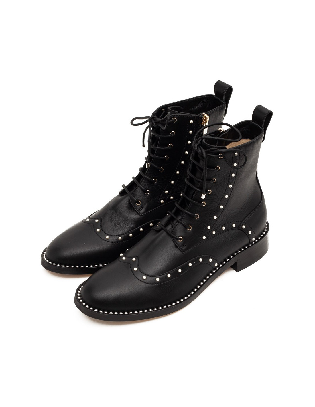 Bottines à lacets en cuir de veau noir perlé, avec une semelle en cuir beige et caoutchouc cranté en forme d'écaille de serpent. Elles sont dans une version rock et confortable. Elles ont une épaisse semelle en caoutchouc. Vous êtes parée pour tout l'hiver.
