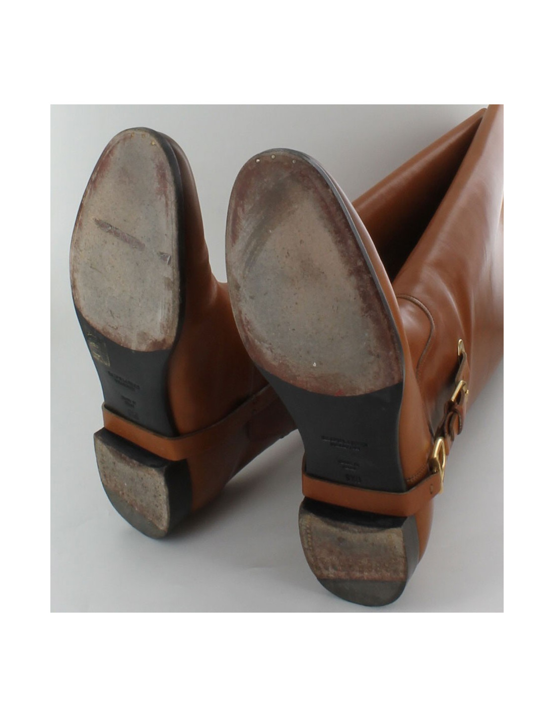 Ces Bottes jumping RALPH LAUREN, sont en cuir naturel beige. C'est une taille 9 1/2 B qui équivaut à un 40,5 FR. Les semelles sont en cuir. Sur chaque botte on trouve un étrier en métal doré qui est un clin d'oeil à l'équitation. Elles montent sous le genou. Elles sont en bon état d'usage, on observe quelques traces d'usures sur la tige, et la bijouterie intérieur à de petites traces d'oxydation (voir photo).