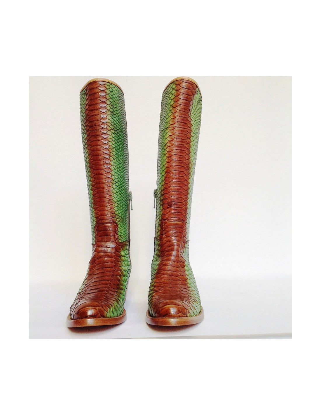 Exceptionnel ! bottes PRADA T35 en python vert en marron. L'interieur est en cuir marron.