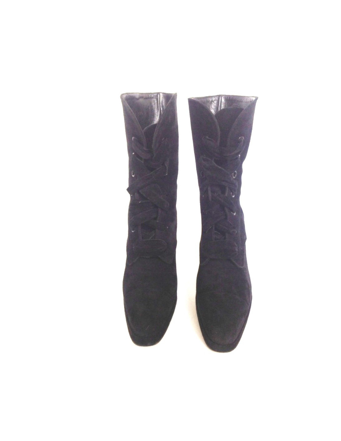 Bottines à talons et à lacets Chanel en daim noir T 39,5. look 90 ' . En très bon état. Très légère usure du daim à l'arrière des chaussures.