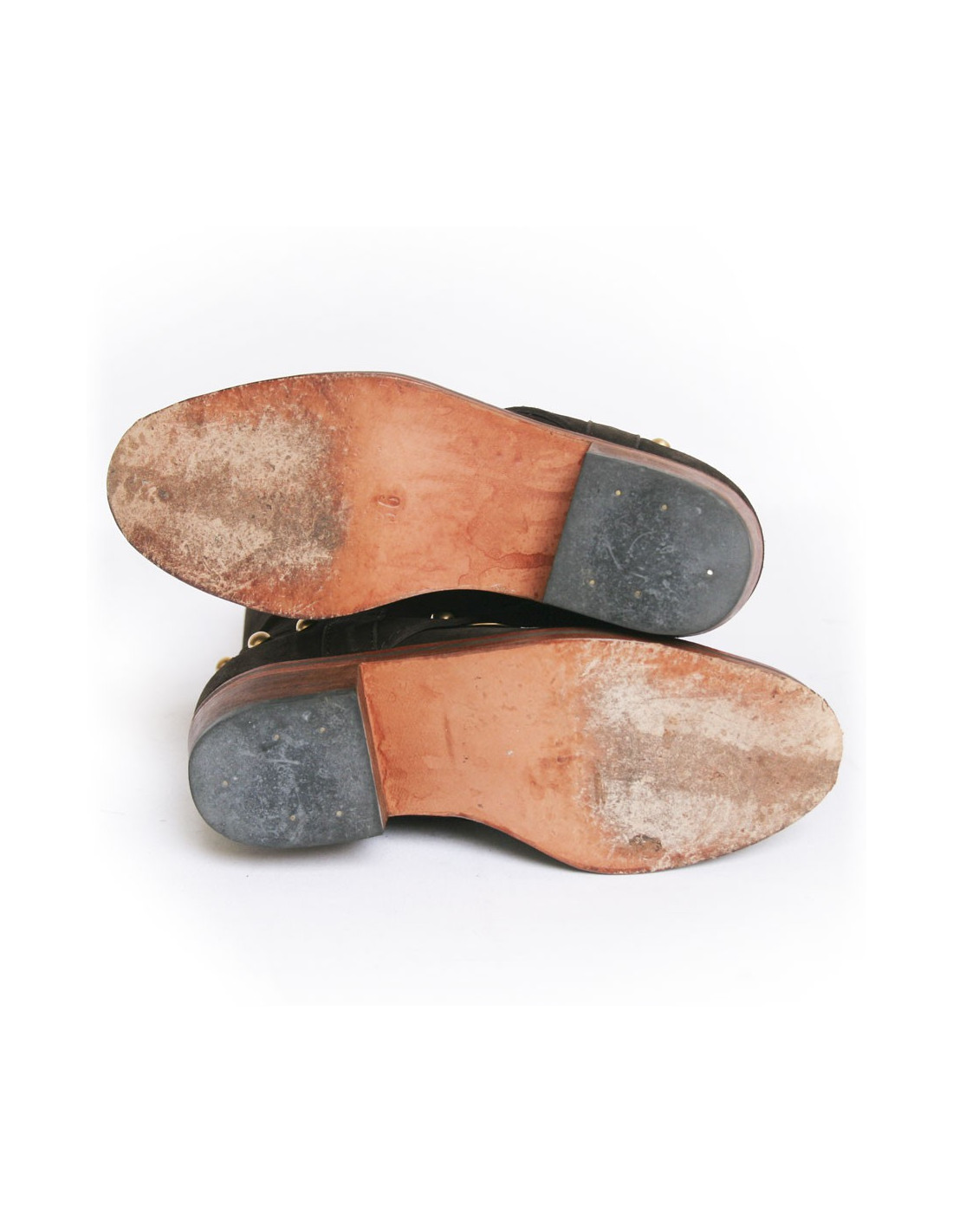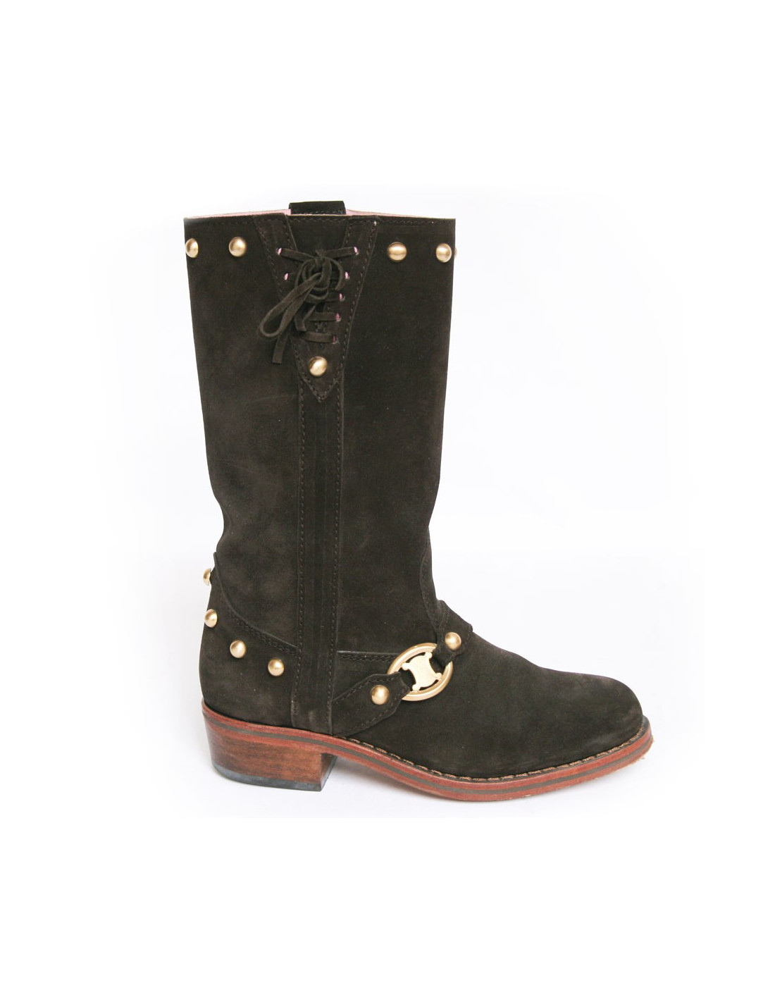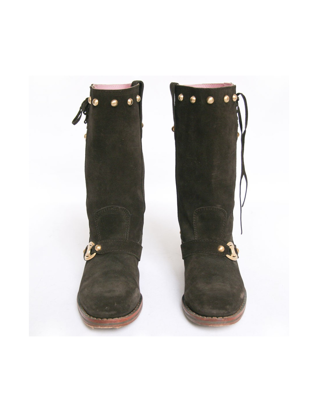 Cette jolie paire de bottes Céline est en veau velours marron. Elles sont cloutées derrière et sur le haut de la botte. Lacées de chaque côté sur le haut. Leur semelle est en cuir. L'intérieur est en cuir rose pâle et le talon est en suèdine. Elles sont en très parfait état. Légère usure du veau velours sur la botte droite sur l'intérieur à cause du frottement. Voir photo.