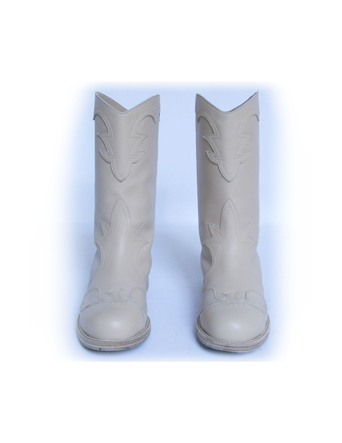 Magnifique paire de bottes Chanel en cuir de couleur nude. Taille 39,5. Cuir brodé. Surpiqures nude. En très bon état.