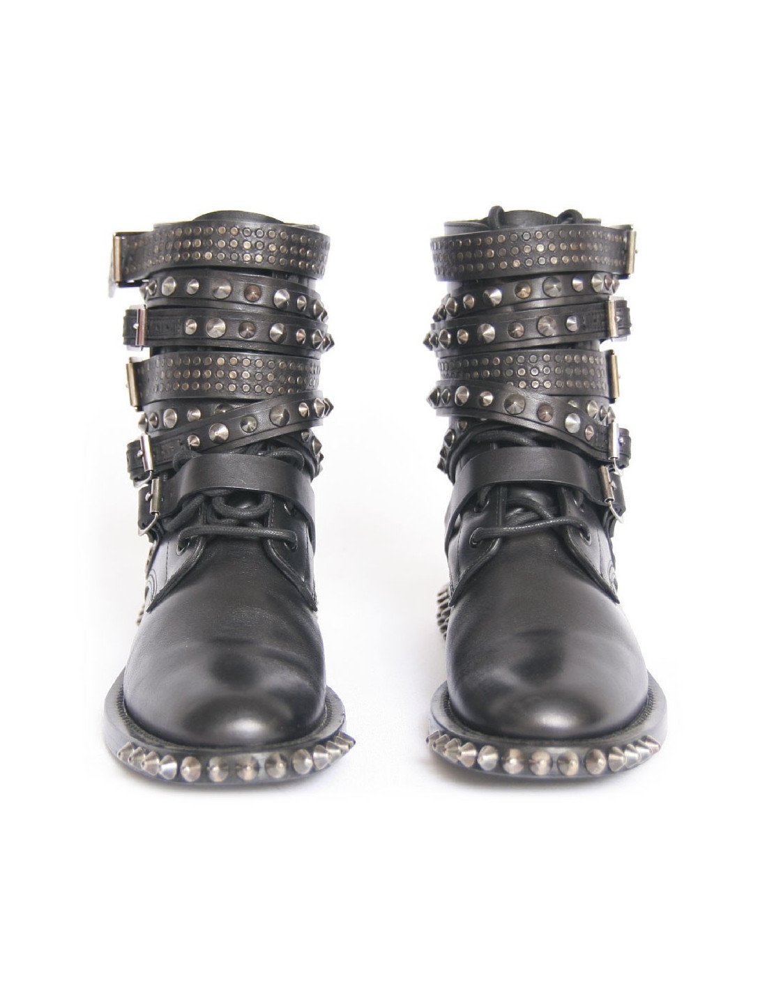 Boots à laçets Yves Saint Laurent en cuir noir, agrémentée de 5 brides réglables à clous plats et pointus, boucles gravées Saint Laurent et clous pointus le long de l'avant de la semelle et du talon. En très bon état. Légères griffures sur l'intérieur des chaussures mais très peu visible. Taille 36. Prix public 1795 euros.