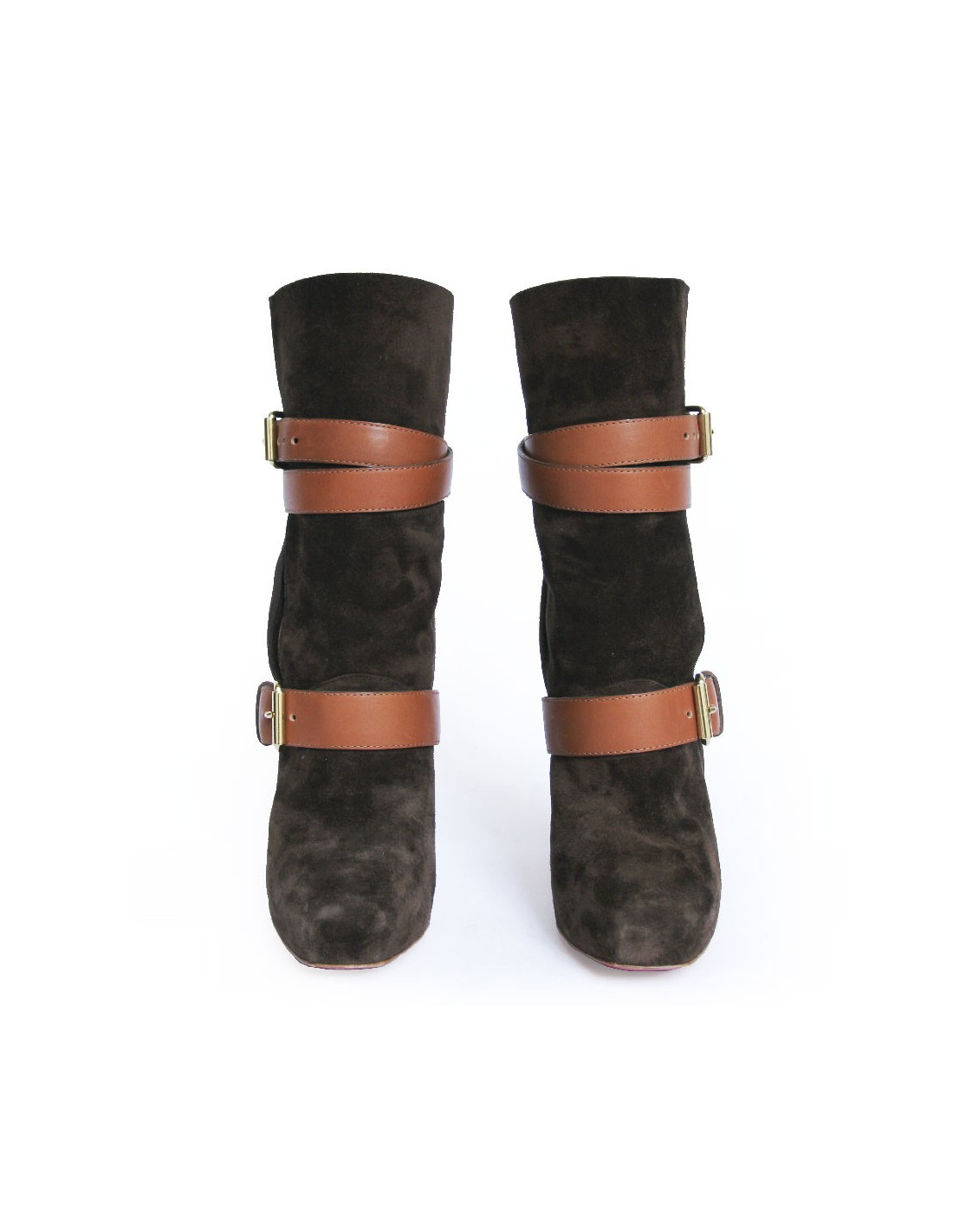 Boots à talons Christian Louboutin en veau velours marron. Taille 38. Des sangles en cuir viennent entrelaçées la cheville. La bijouterie est en métal doré. En très bon état. Très légère usure du velours à certains endroits mais peu visible.