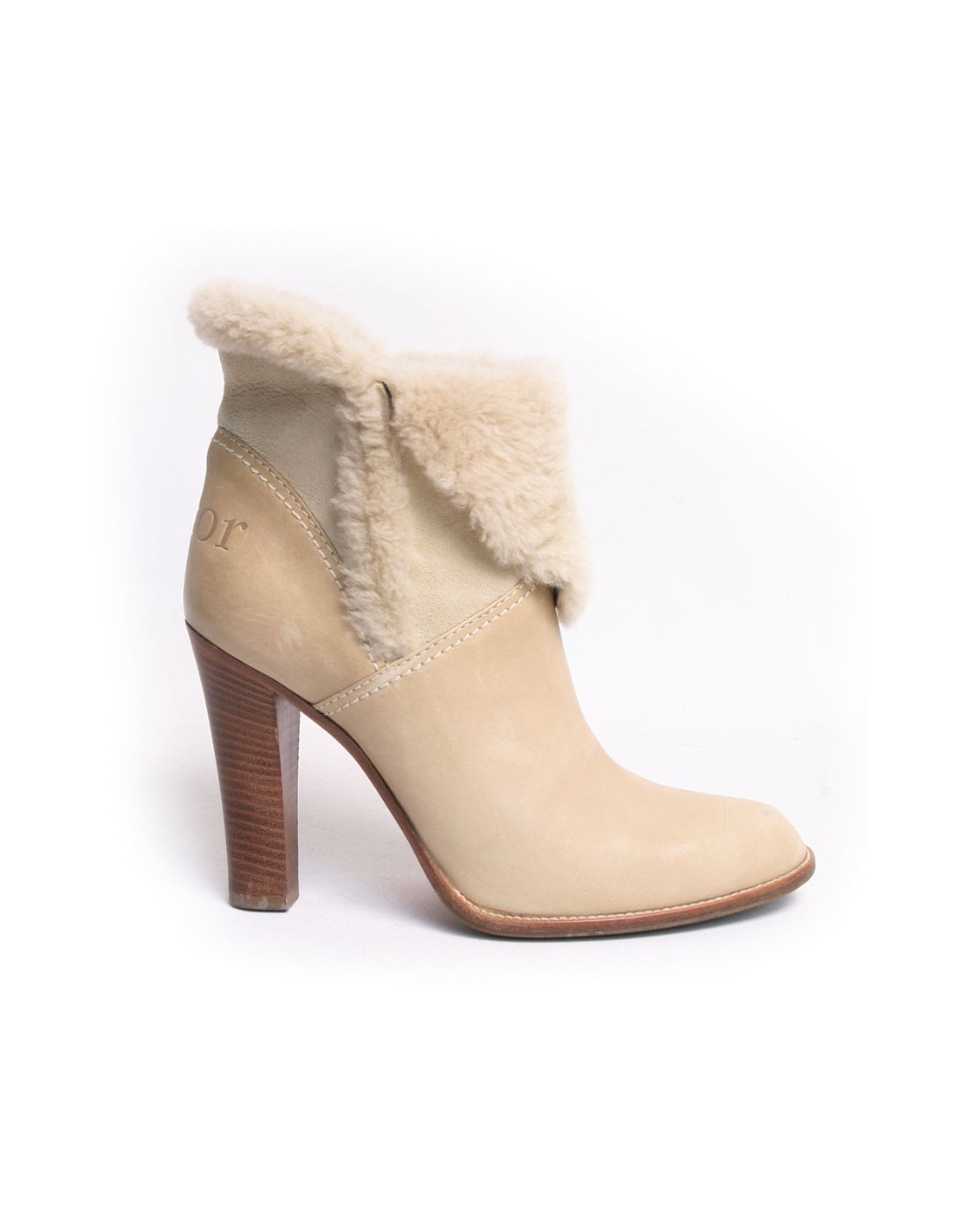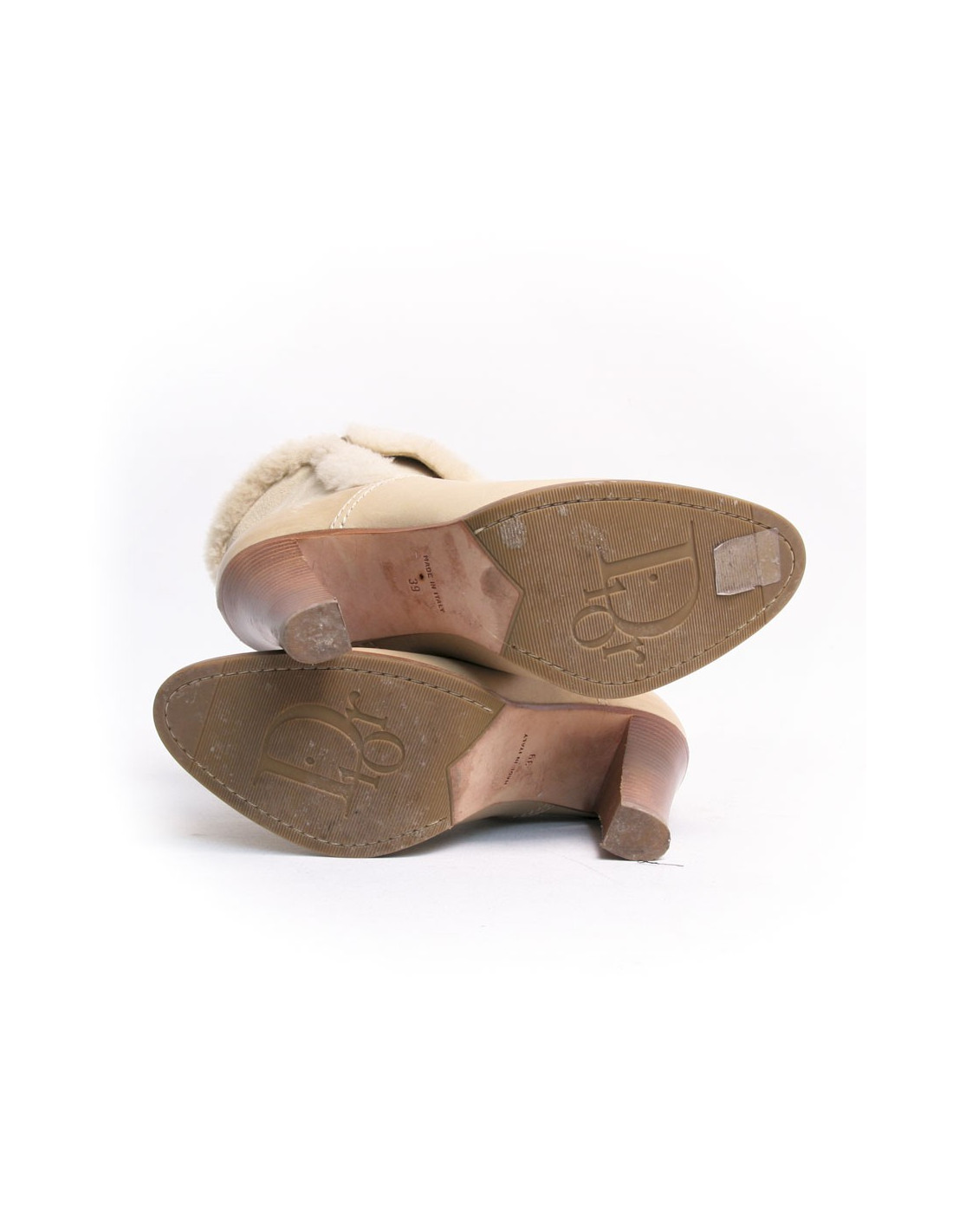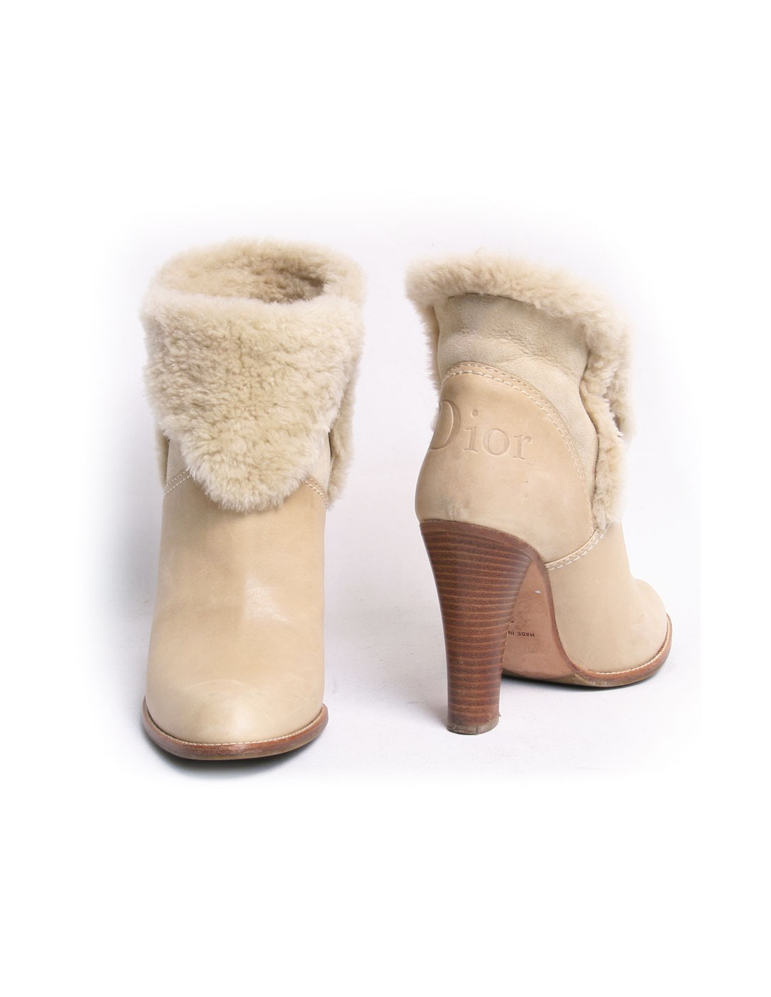 Boots à talons Dior en peau retournée et cuir beige. Taille 39. Une inscription "DIOR" figure à l'arrière au niveau du talon. En très bon état. Légère griffure sur le pied droit. Voir photos.