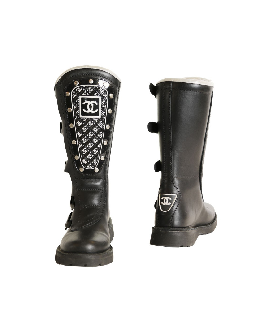 Collector ! Bottes mi-hautes Chanel en cuir noir. Plastron à l'avant de la botte en plastique noir et blanc avec des clous en métal argenté et le sigle "CC" un peu partout. L'intérieur est en cuir argenté. Taille 36. De bas en haut ces bottes disposent de sangles à 4 trous pour serrer ou agrandir. Jamais portées (traces de stockage)