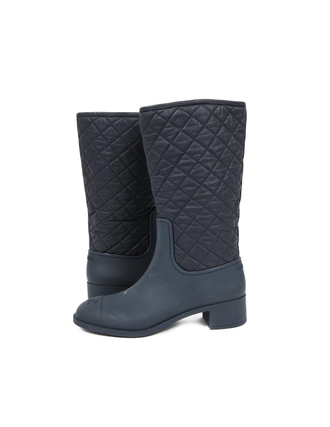 Mi-bottes Chanel en cuir matelassé bleu et plastique. Etat neuf. L'intérieur est doublé de cuir.