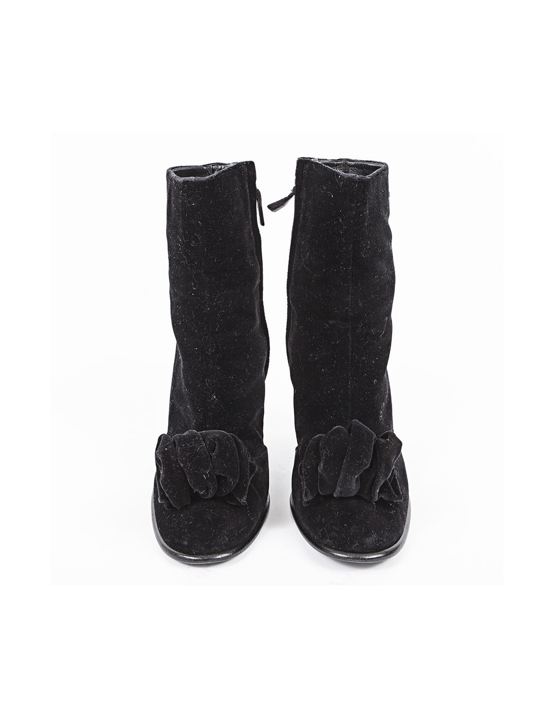 Bottines à talons de la Maison Chanel en veau velours noir. Taille 39. Ravissant noeud à l'avant. Fermeture zippée à l'intérieur. Sigle 'CC' doré à l'extérieur de la bottine. En très bon état. Léger frottement sur le talons mais très peu visible.