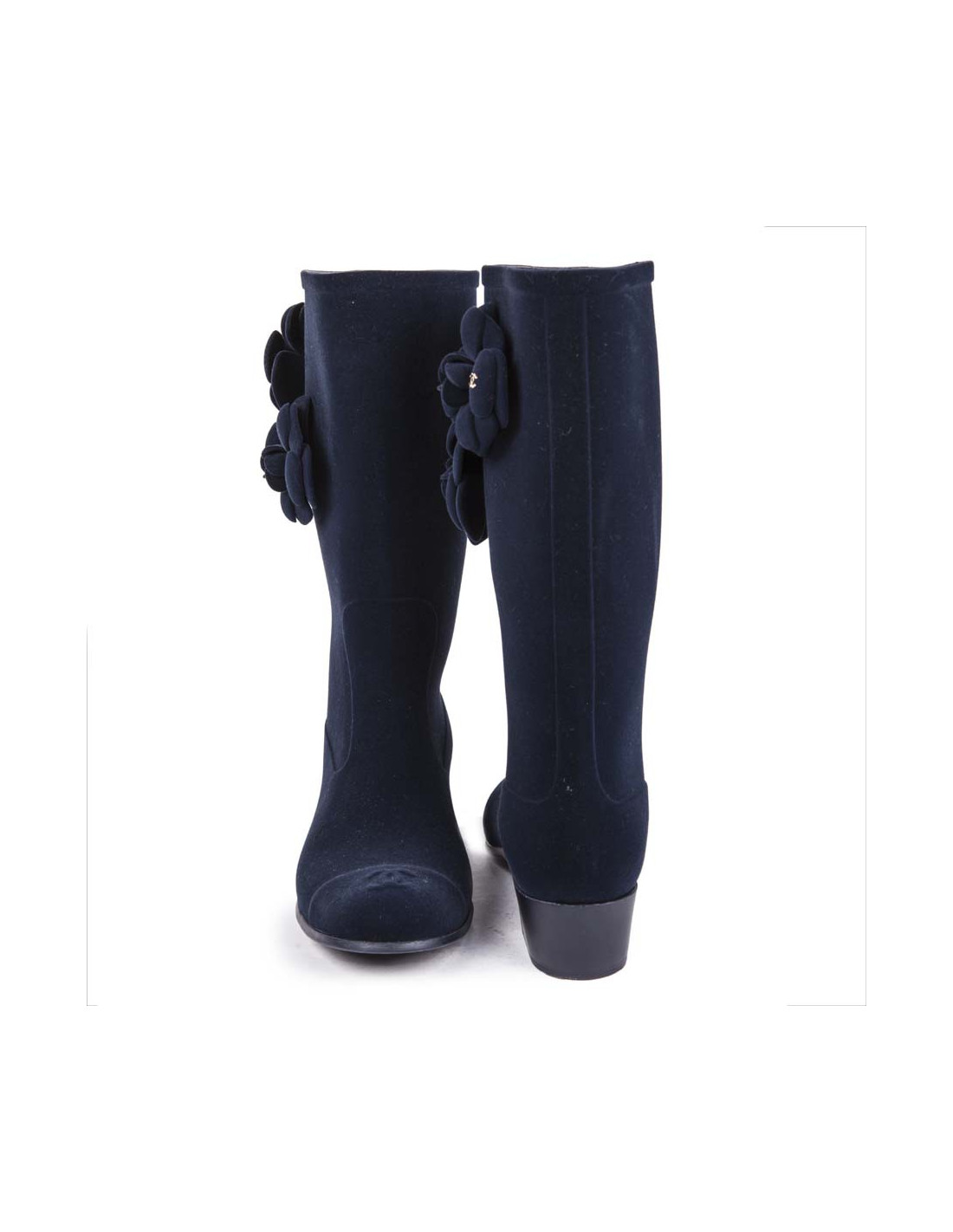 Bottes de pluie de la Maison Chanel façon velours bleu marine. Taille 38.